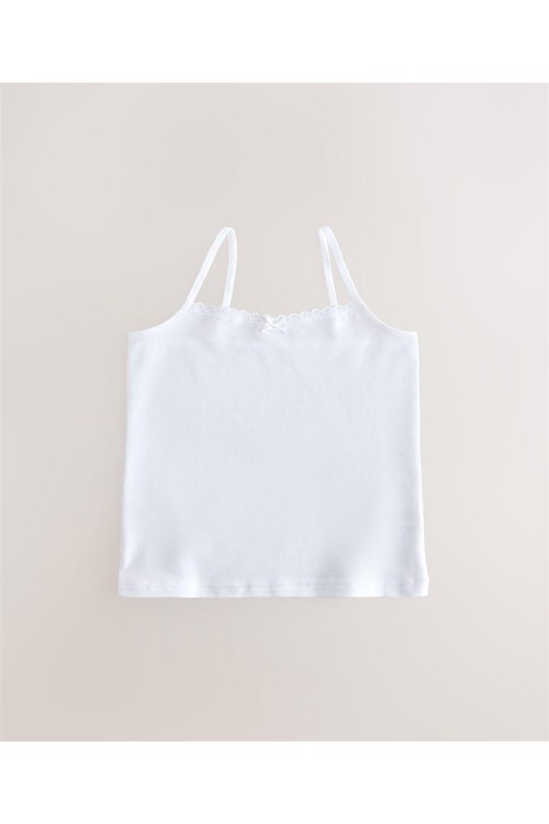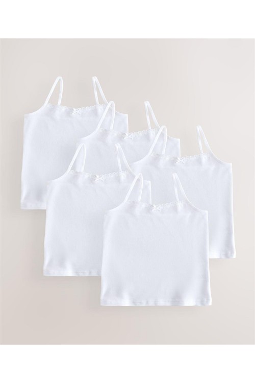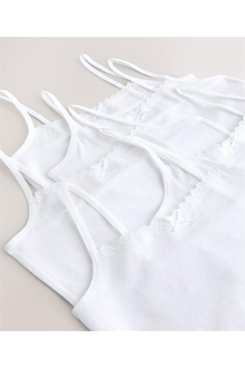 Нашият комплект от 5 бр.потници с тънки презрамки са изработени от богата на памук материя с добавена еластичност, украсени с дантелени детайли и панделка.