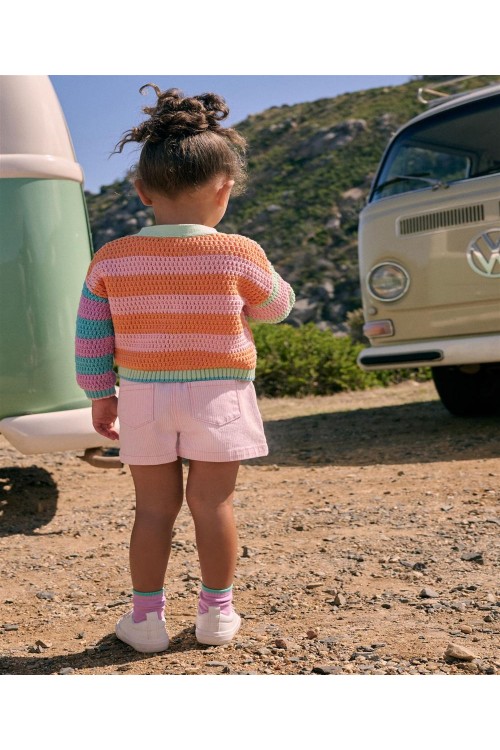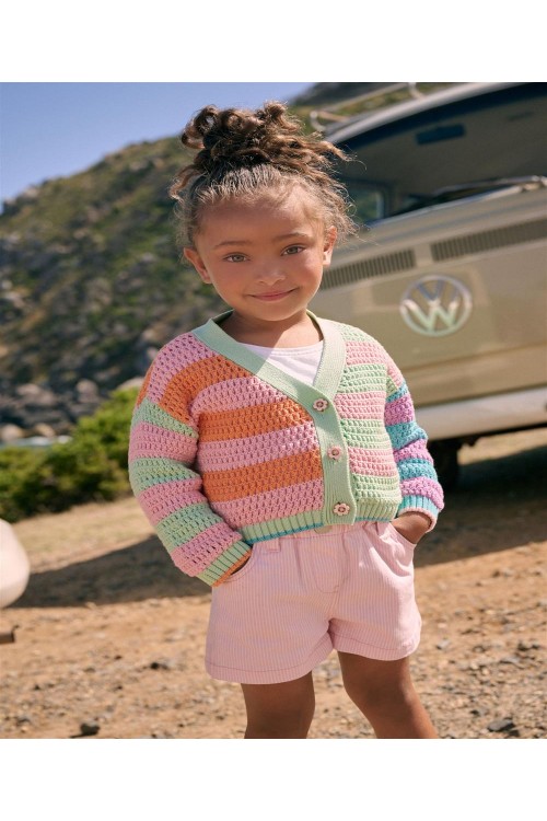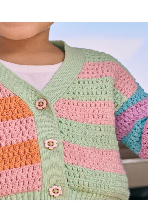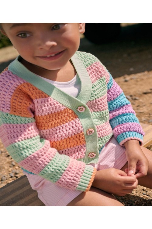 Запазете цветното настроение с нашата плетена жилетка с цветовете на дъгата. Ярко допълнение към гардероба ѝ, тази жилетка е с цветни копчета, контрастен дизайн на райета и V-образно деколте.