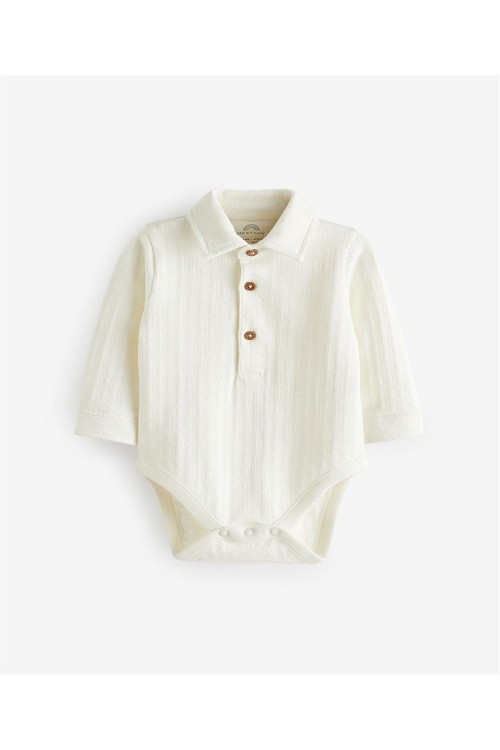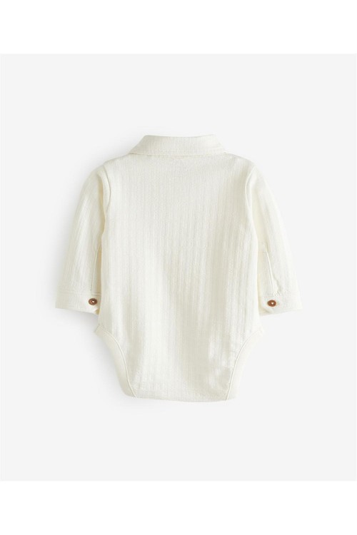 Поддържайте малкото си ангелче топло и уютно в нашето бяло текстурирано боди- риза. Изработено от мек и дишащ памук, това стилно боди е проектирано в силует, вдъхновен от риза, с дълги ръкави и яка. Допълнено с копче за лесно обличане без никел. Може да се пере в пералня.
