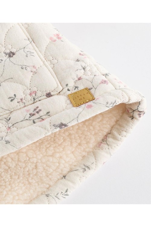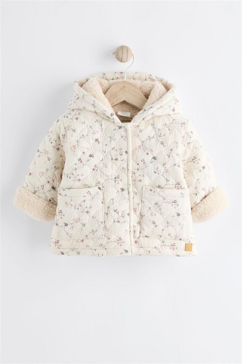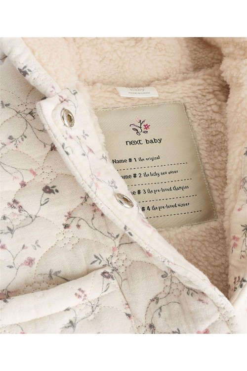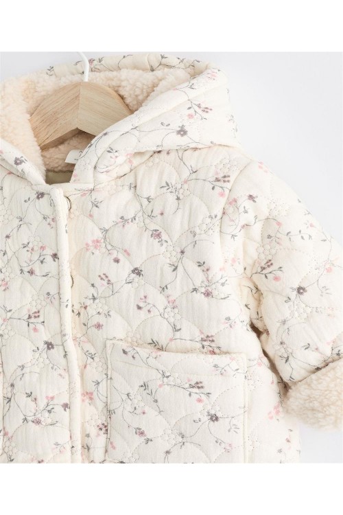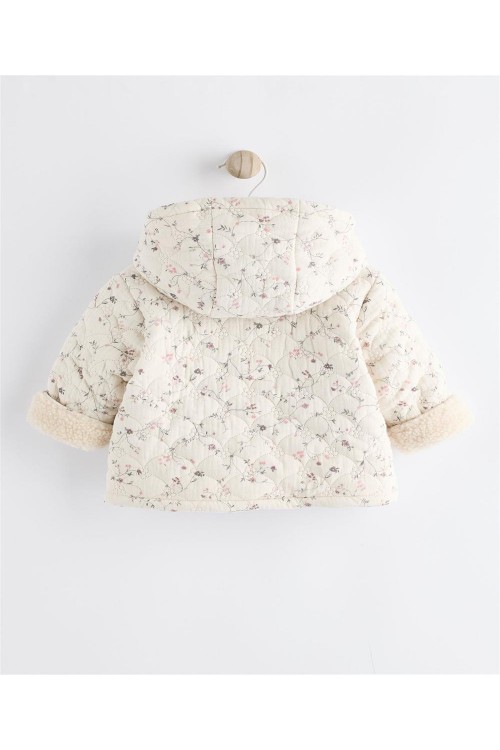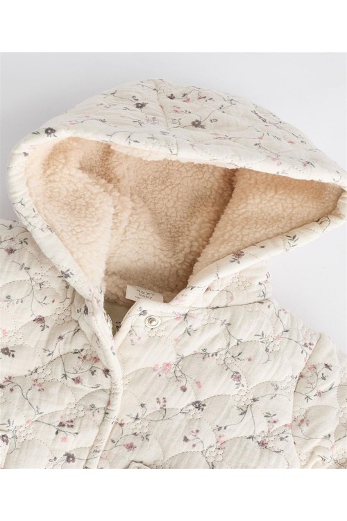Това красиво бебешко яке в кремав цвят е украсено с нежен флорален принт и капитонирана изработка. Изработено е от мека, подплатена материя, която осигурява топлина и комфорт. Якето има качулка и пухкава вътрешна подплата за допълнителна изолация, както и подгънати ръкави за очарователен вид. С два предни джоба и цип, то е едновременно практично и стилно – идеално за студените дни и разходки навън.