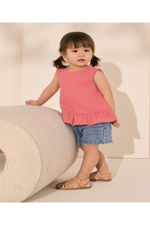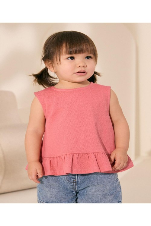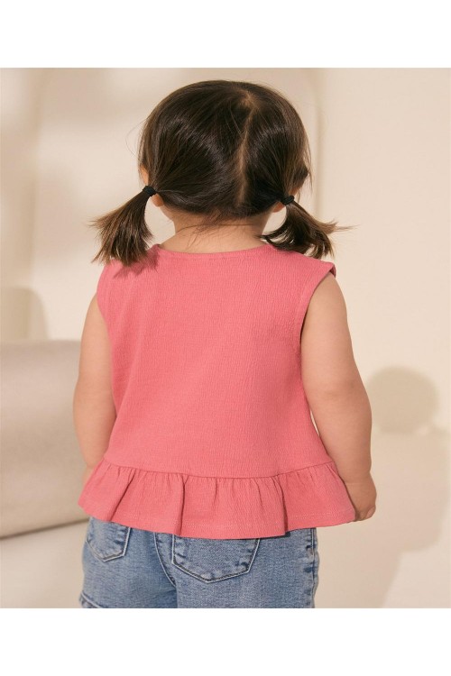 Нашият текстуриран потник с пеплум добавя забавен щрих към летния ѝ стил. Изработен от памучна смес с текстуриран джърси плат.