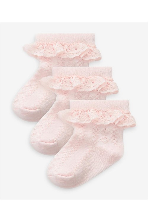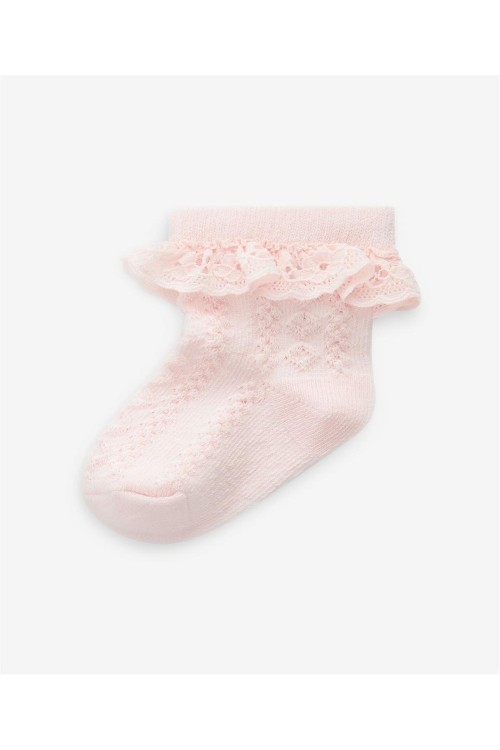 Нашите розови дантелени бебешки чорапи включват деликатен дантелен детайл, който добавя допълнителна нотка сладост към облеклото на вашето мъниче. Изработени от супер мека материя, тези чорапи са не само стилни, но и без вредни бои и химикали, осигурявайки максимален комфорт за деликатната кожа на вашето бебе.
