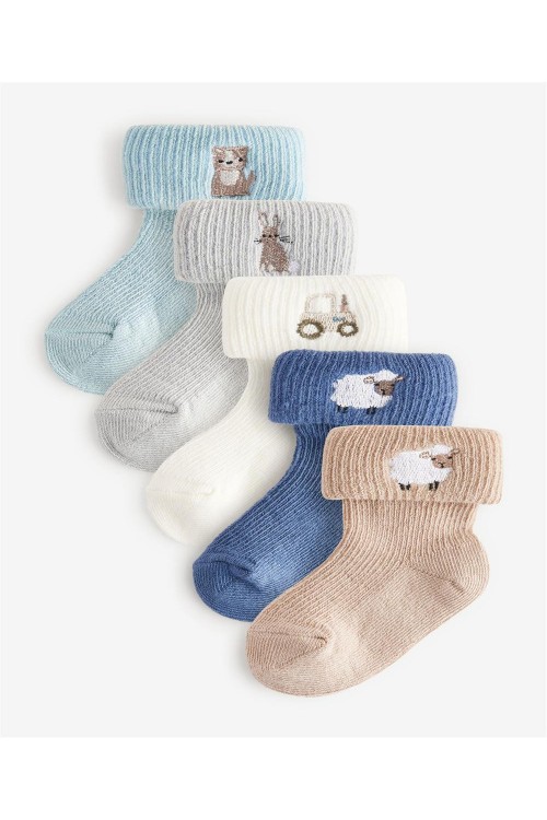 В удобна опаковка от 5 броя, тези сладки чорапки са идеални за вашето мъниче, изработени от супер мека памучна смес, с бродирани герои от фермата. Може да се перат в пералня.