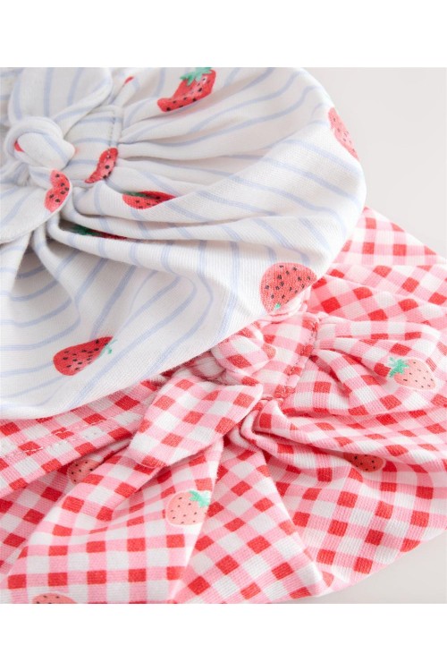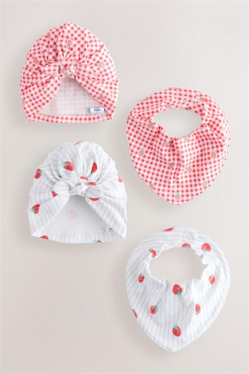 Добавете плодов привкус към визията ѝ с нашия комплект от тюрбан с ягоди и лигавник. Този комплект от 4 части включва 2 тюрбана и 2 лигавника, изработени от памучна смес и украсени с щампа с ягоди.