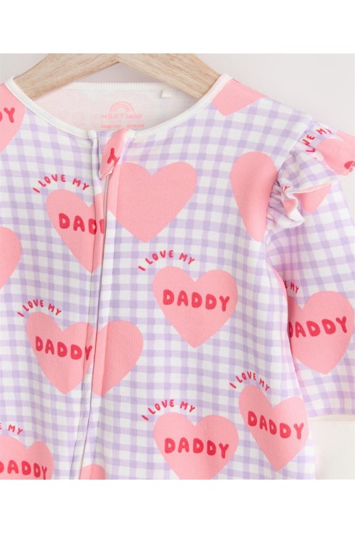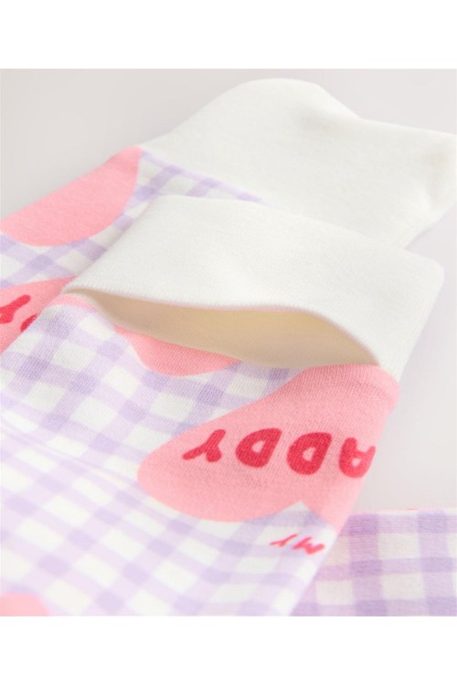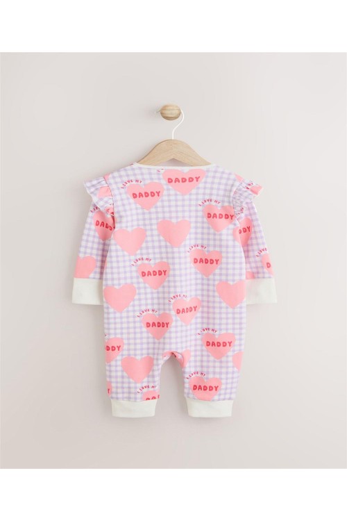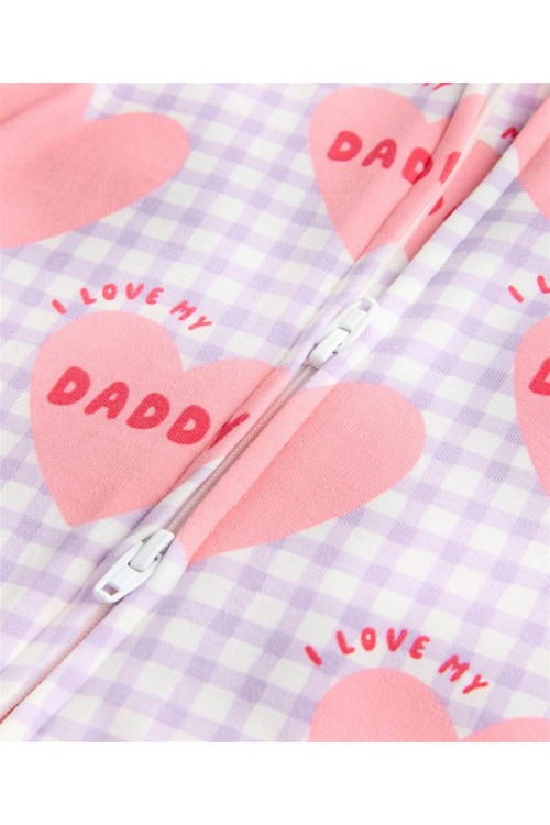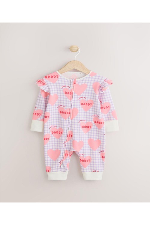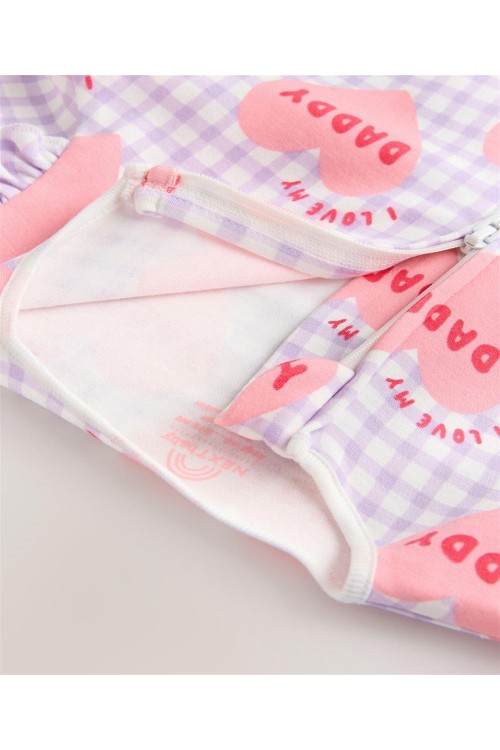 Изработена от мек памук, тази пижамка в лилаво с щампа на сърца има двупосочен цип за лесно преобличане и ръкавички против драскане, които се обръщат назад, за възраст до 3-6 месеца за допълнителен комфорт.
