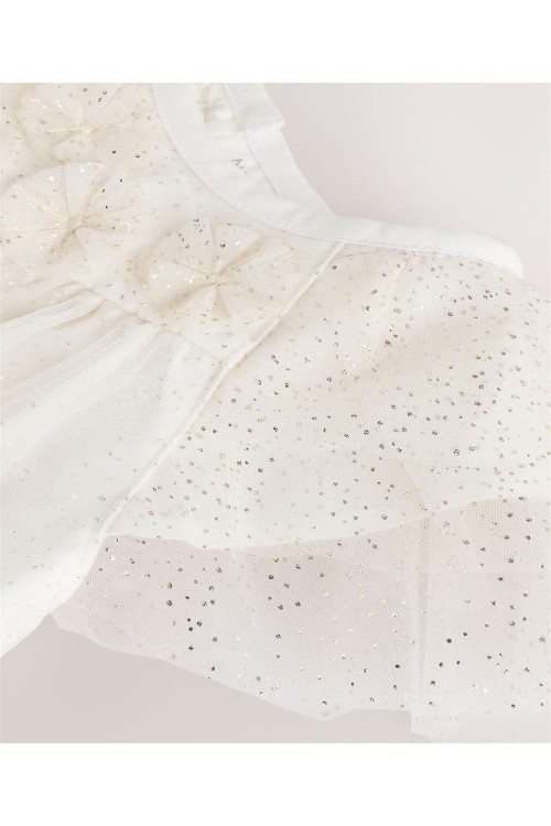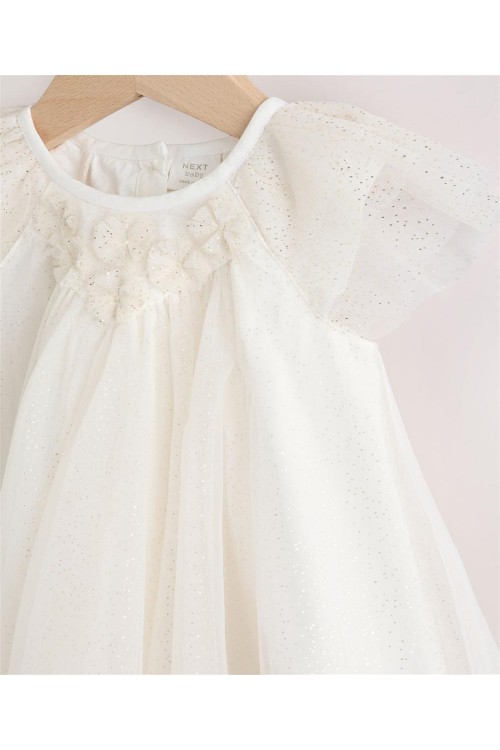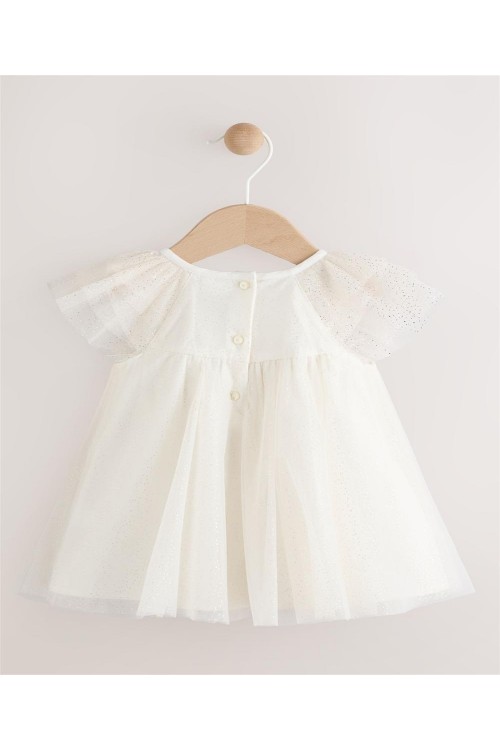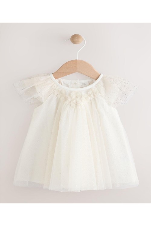 Идеална за специални поводи като сватби, кръщенета и семейни събирания, тази бебешка рокля е с къси мрежести буфан ръкави, красива бродерия и мека подплата.