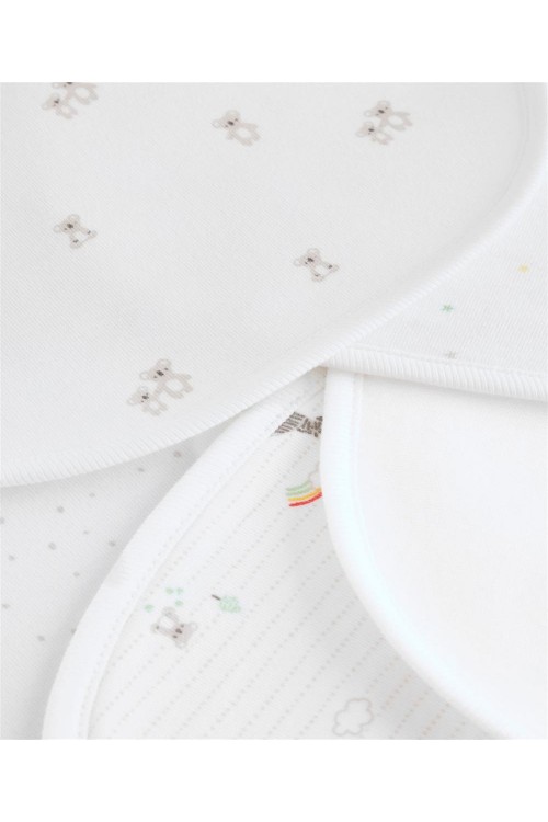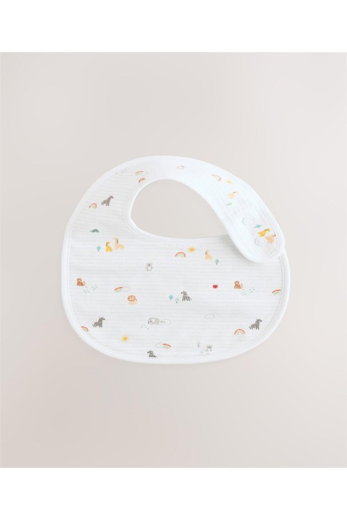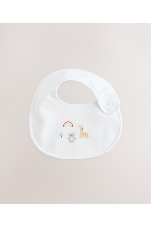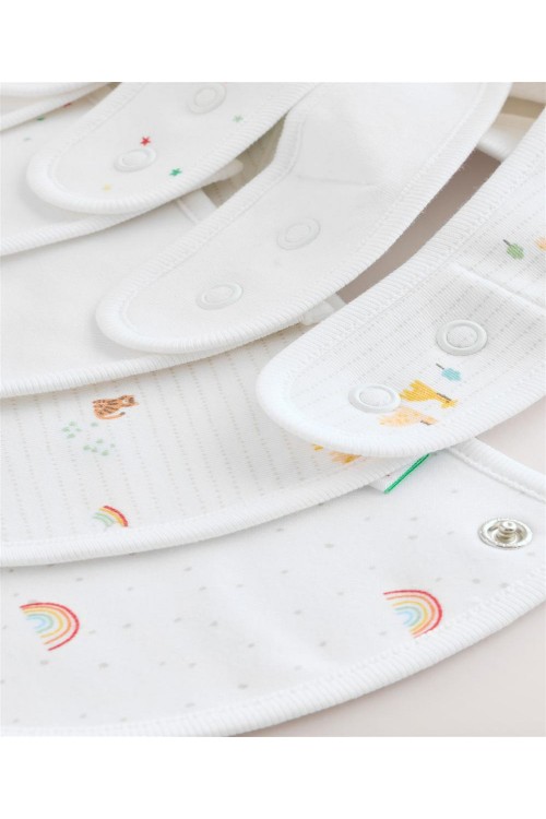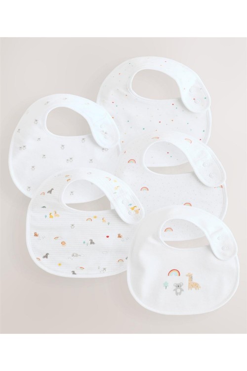 Този комплект от 5 бр. бебешки лигавника е изработен от памучна смес и е украсен със забавни щампи. Всеки лигавник е със слой против капене и закопчаване с копче за лесно обличане.