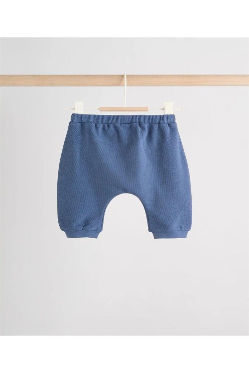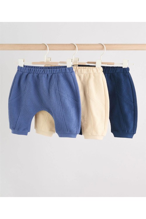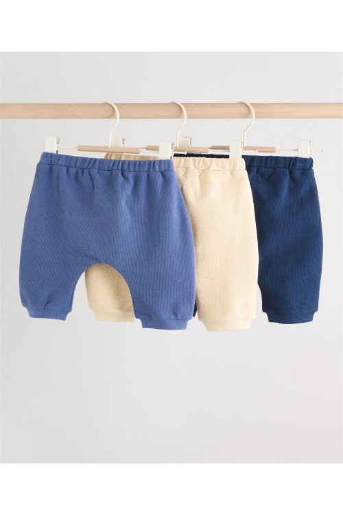Практичен комплект от 3 броя детски панталонки тип джогър в синьо, кремаво и тъмносиньо. Изработени от мек памучен плат с еластичен талия за максимален комфорт и лесно обличане. Подходящи за ежедневието, игра или като допълнителен слой в по-хладните дни.