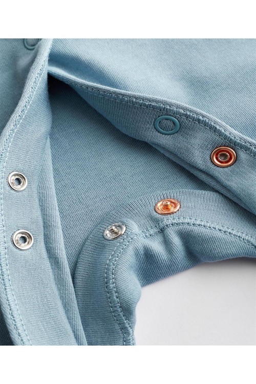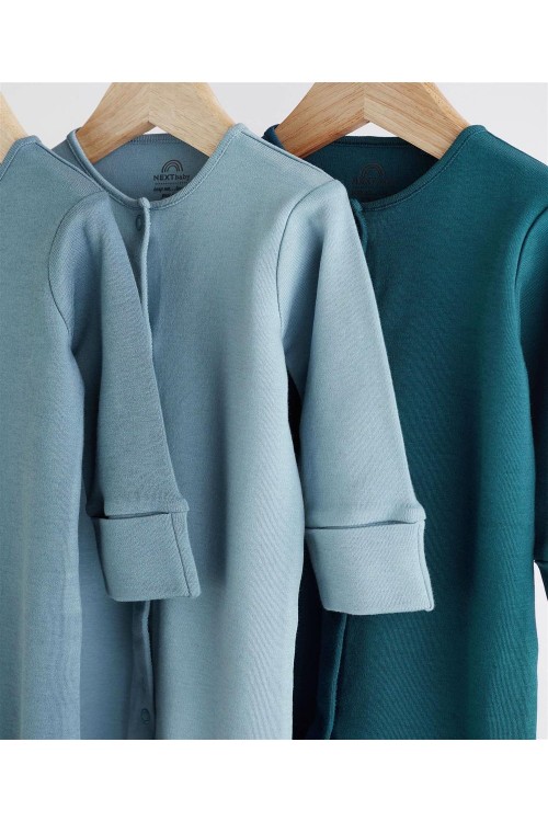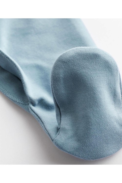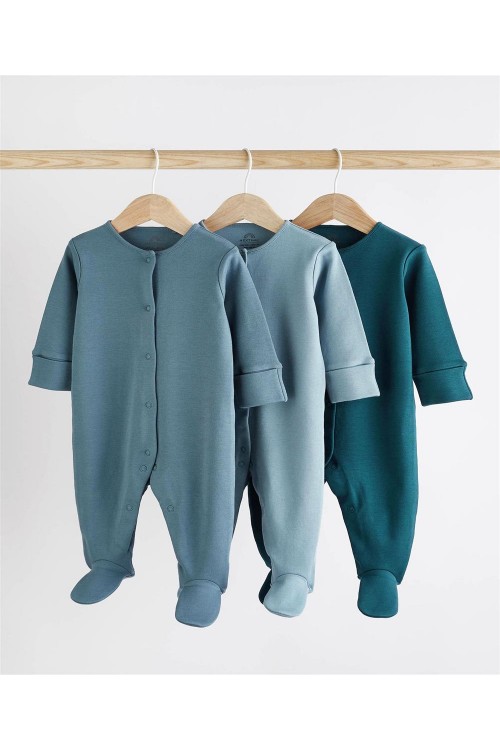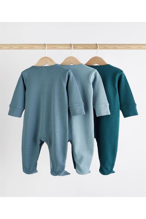 Комплект от три пижамки в петролно синьо от чист памук. С щамповани етикети на гърба на врата, които са супер меки към врата на бебето. Тези пижамки имат вградени ръкавици против драскане до 3-6 месеца, а крачетата са проектирани с подплатена вътрешна част за комфорт. Копчетата без никел гарантират, че няма дразнене на деликатната кожа и не са използвани вредни оцветители или химикали, което предпазва вашето бебе.