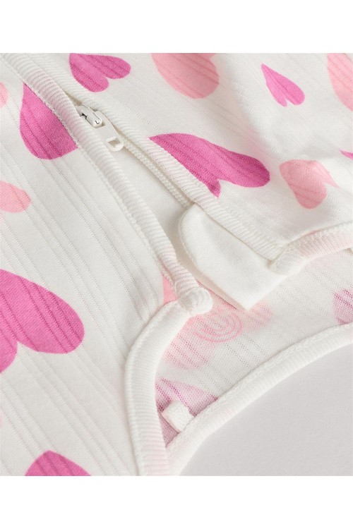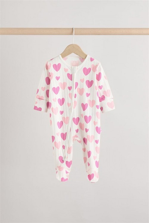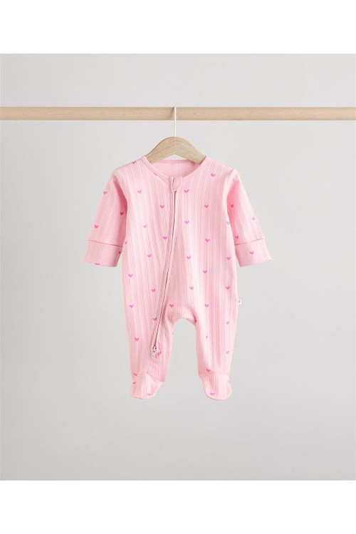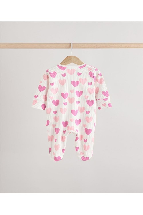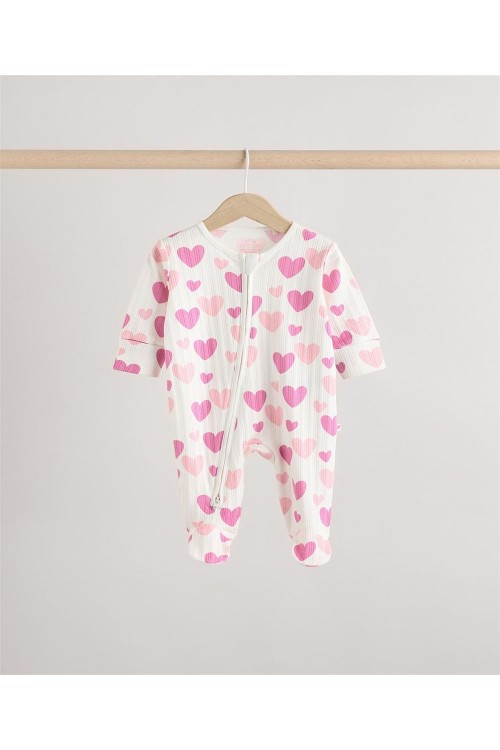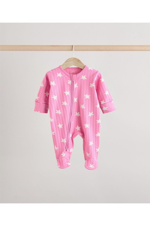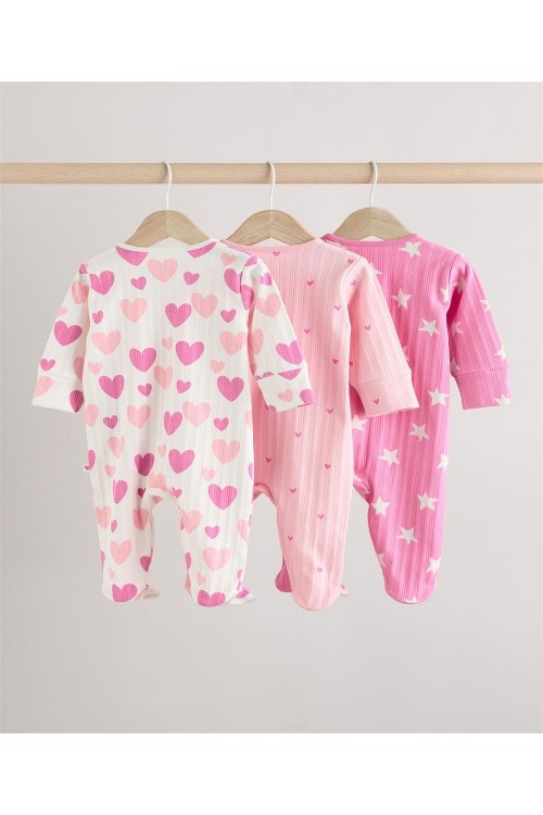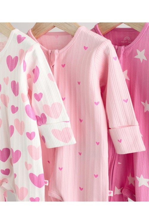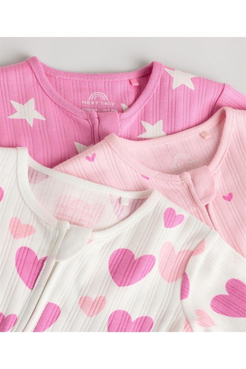 Този комплект от 3 пижамки е с розови нюанси и щампи на сърца и звезди, изработени от чист памук с двупосочно закопчаване с цип за лесно обличане, ръкавици за драскане с обръщане до 3-6 месеца и противоплъзгащи подметки на вътрешните крачета от 9-12 месеца.