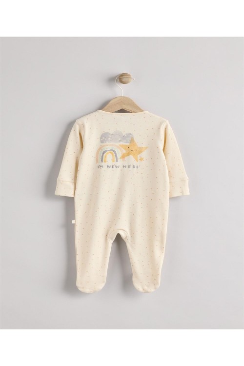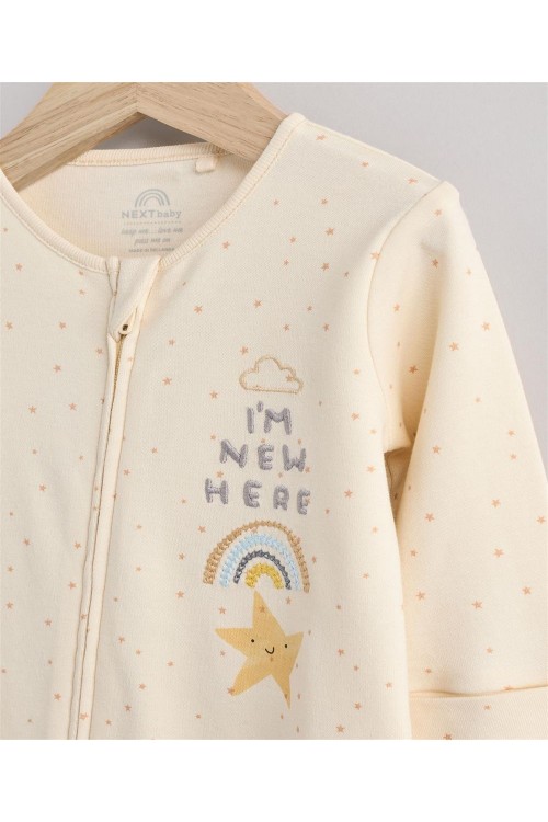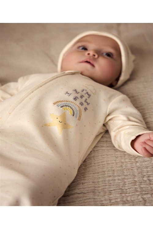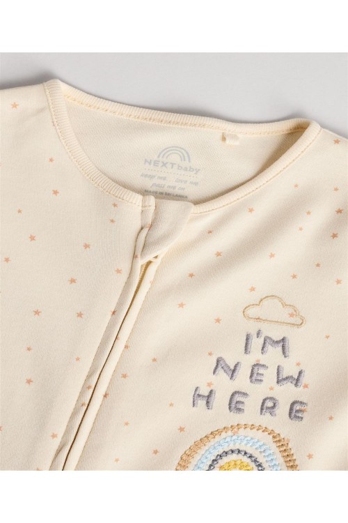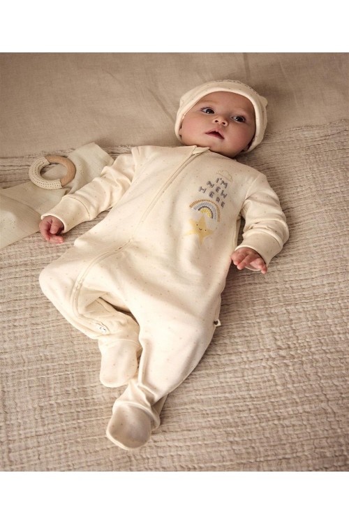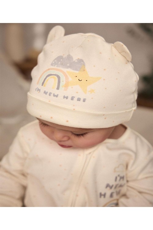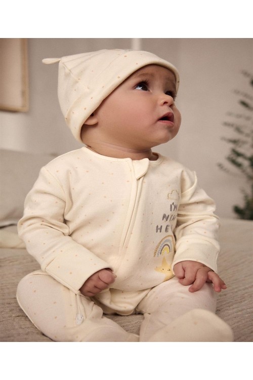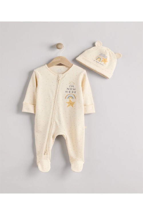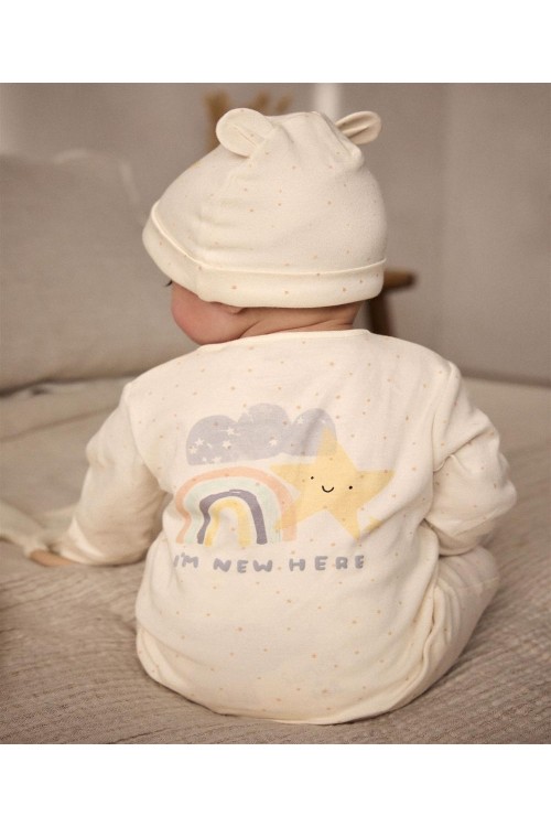 Перфектен за посрещане на новодошлите, този сладък комплект включва пижамка от чист памук с двупосочно закопчаване с цип, дълги ръкави с обърнати ръкавички против надраскване за размери 3-6 месеца и бродиран графичен лозунг „Аз съм нов тук“, завършен с вътрешна подплата на краката и подходяща шапка с 3D ушички.