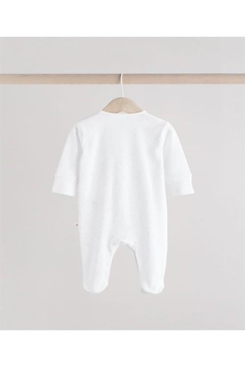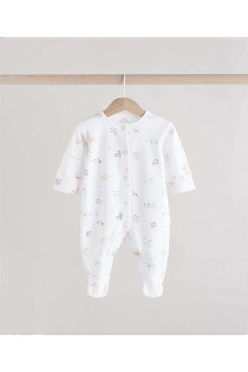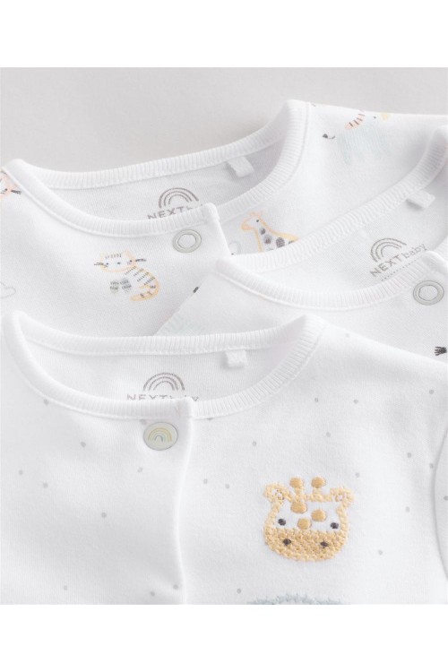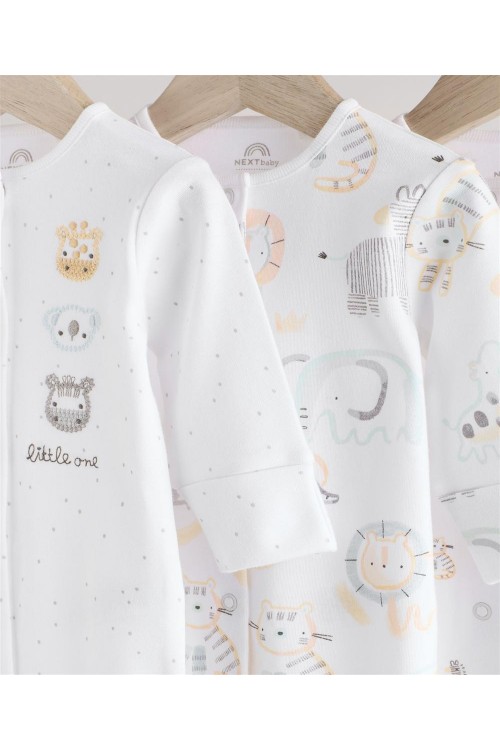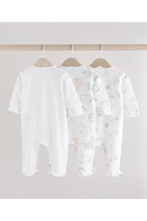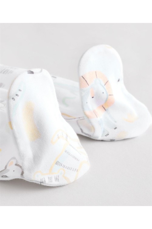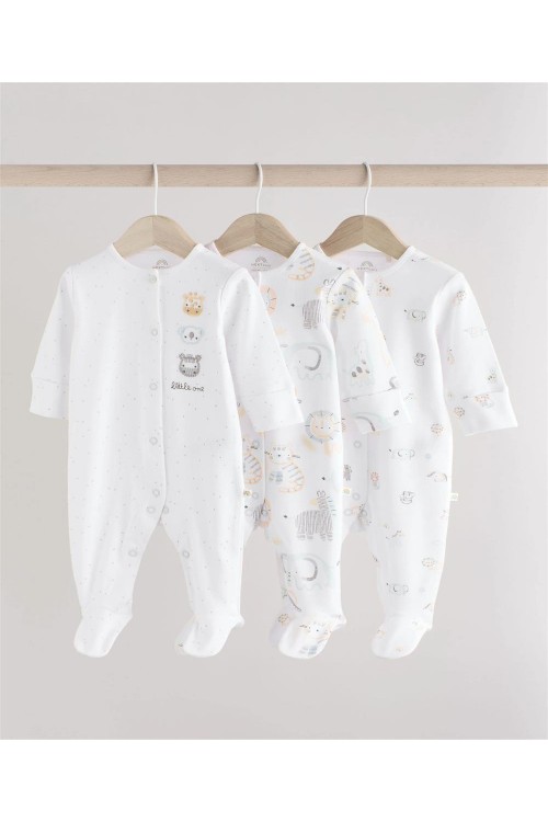 Запасете се с уютни неща за вашето мъниче с този комплект от 3 пижамки от чист памук, със закачливи животински щампи, закопчаване с копчета отпред, ръкавици против драскане до размер 3-6 месеца и щампа с противоплъзгаща се подметка от размери 9-12 месеца.