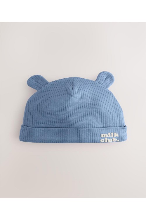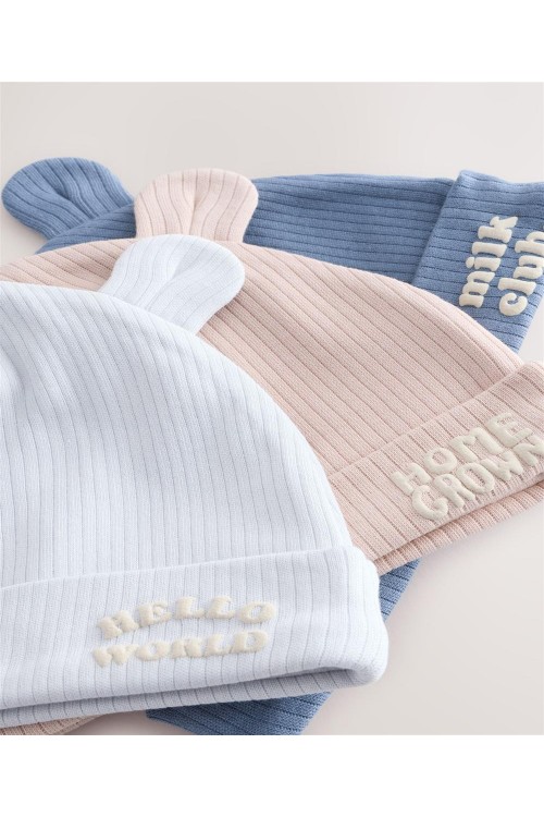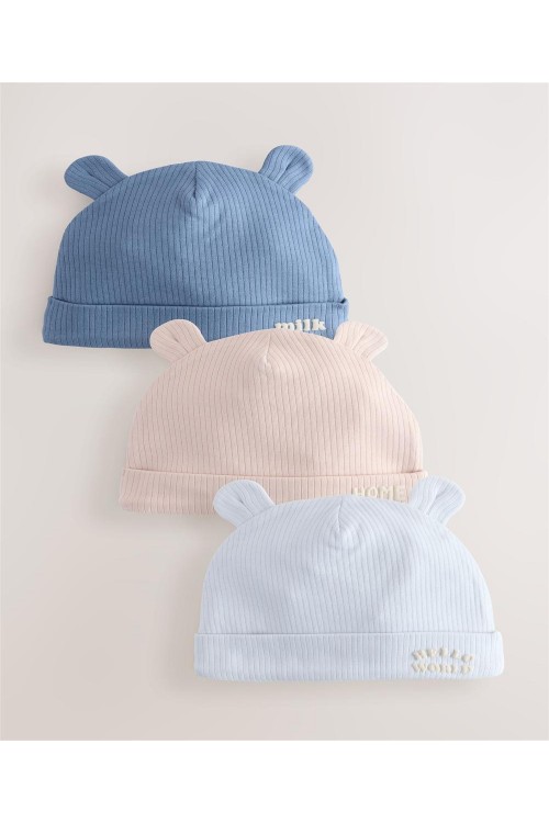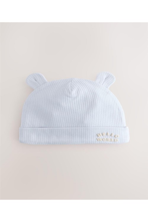 Нашият комплект от 3 сини бебешки шапки е идеален за затопляне на главичките им. Изработени от чист памук с рипсена текстура, те са допълнени с малък дизайн с надпис и забавни ушички. Могат да се перат в пералня.