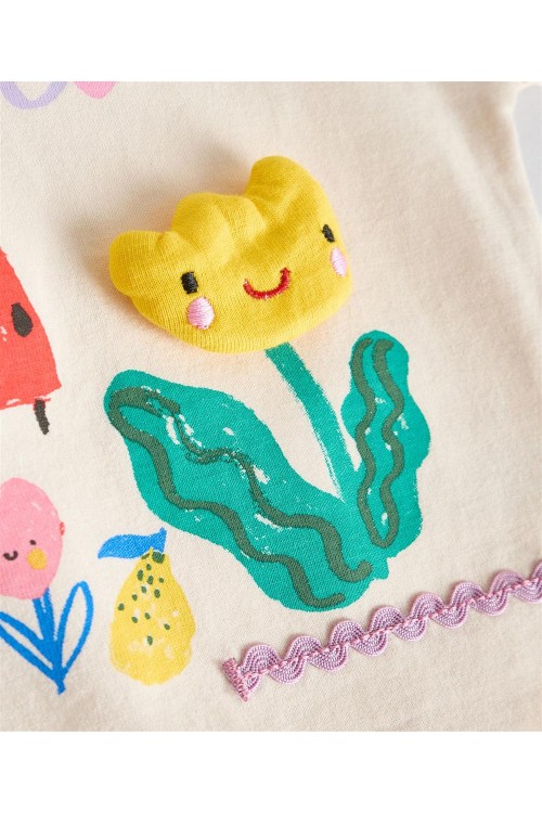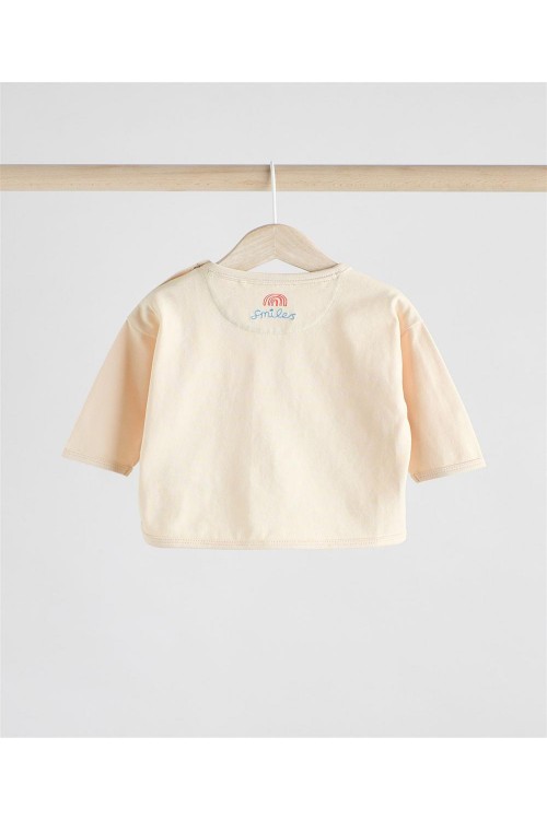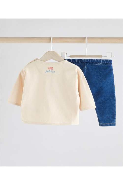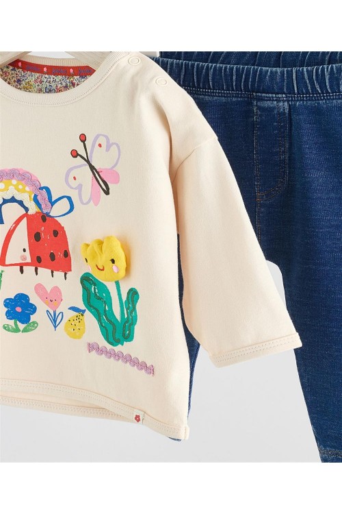 Този комплект от две части, изработен от памучна смес, включва топ с дълъг ръкав и еластичен клин. Със забавни 3D апликации на горнището и закопчаване с копчета на деколтето, този комплект е сладко и удобно допълнение за вашите малчугани.
