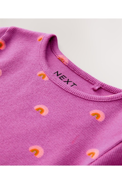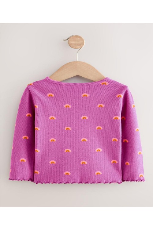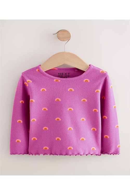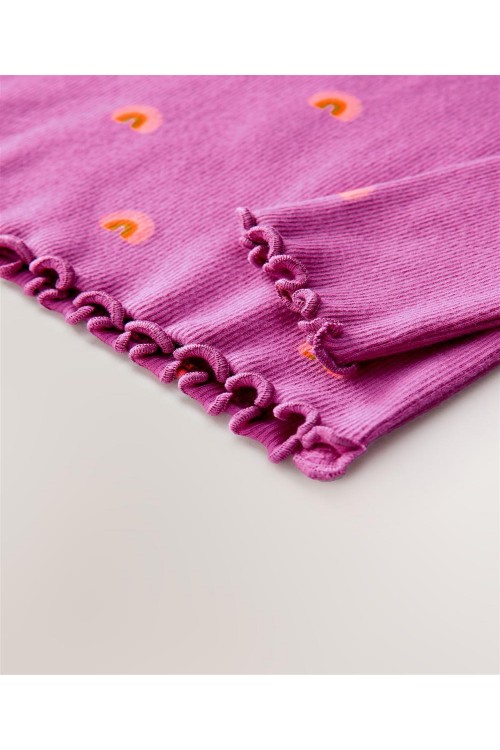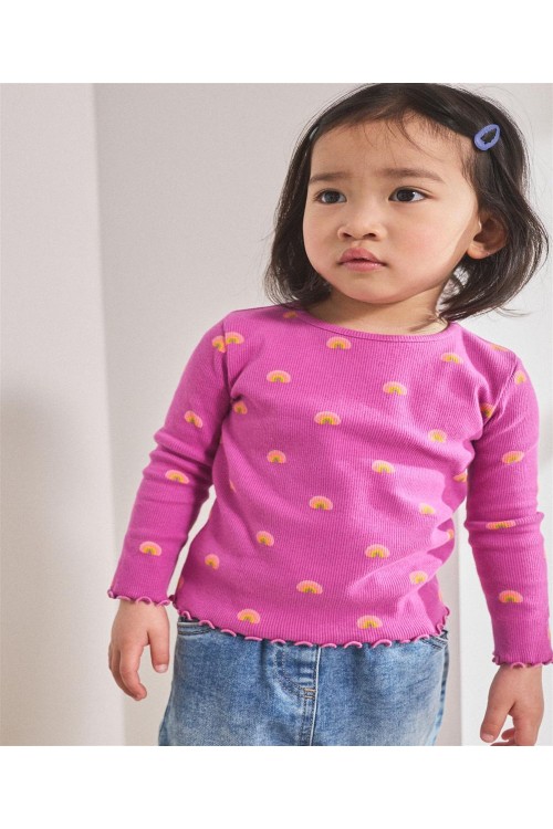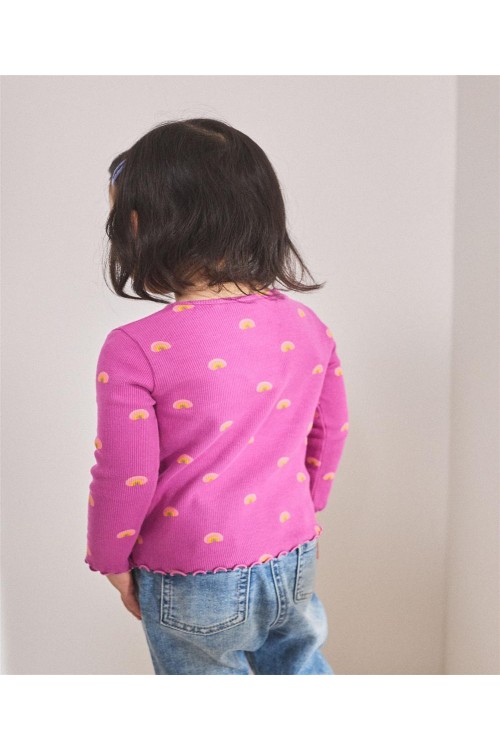 Тази очарователна рипсена блуза с дълъг ръкав в цикламено има забавен принт с дъги, което я прави вълшебно допълнение към гардероба на всяко дете. Вълнообразният подгъв добавя чаровен акцент, а удобната материя гарантира комфорт през целия ден. Идеална за ежедневни приключения.