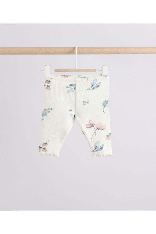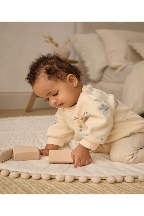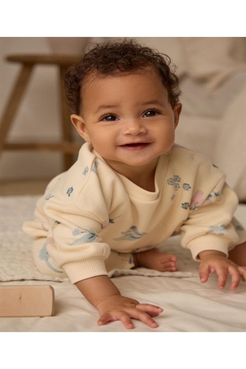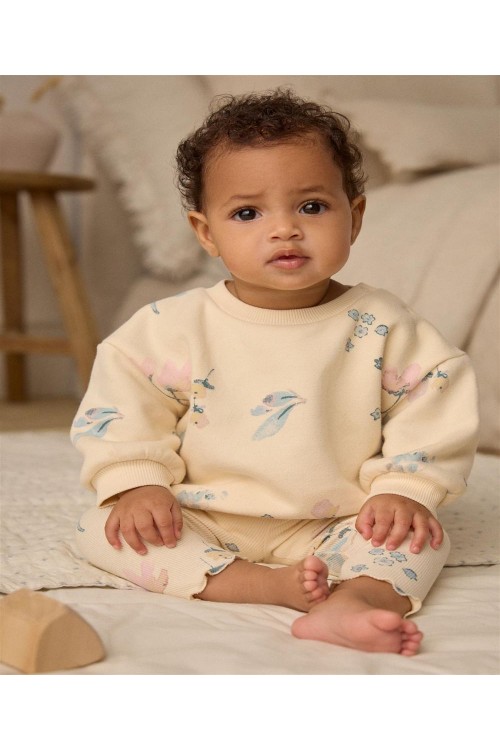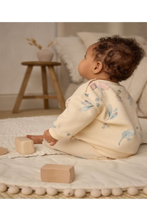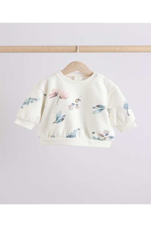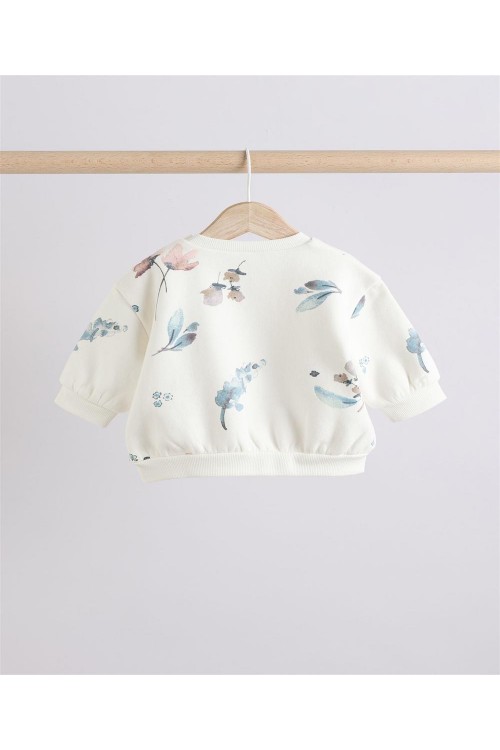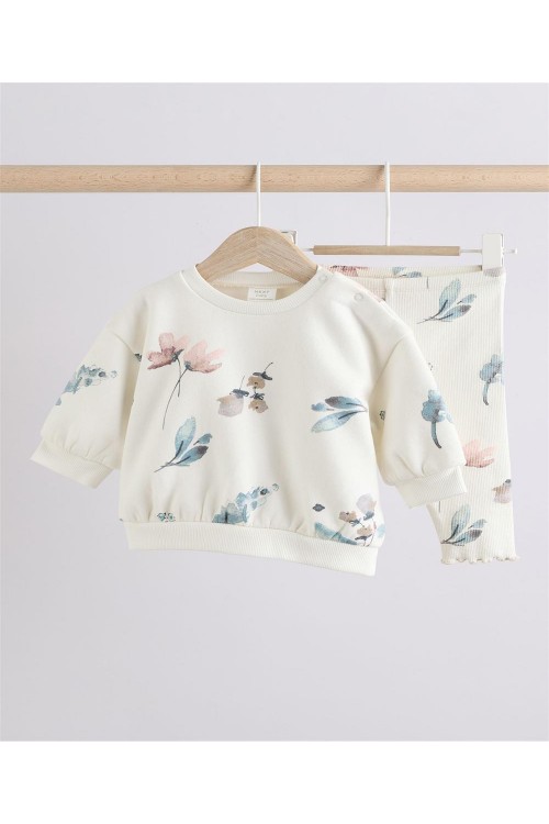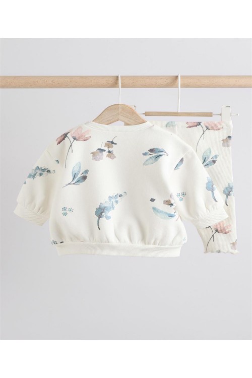 Този удобен комплект от 2 части, в бяло с флорален принт, е сезонно облекло, включващо суитшърт с обла яка от богато на памук трико, закопчаване с копчета тип тик-так, както и чифт удобен и разтеглив клин с еластична талия.