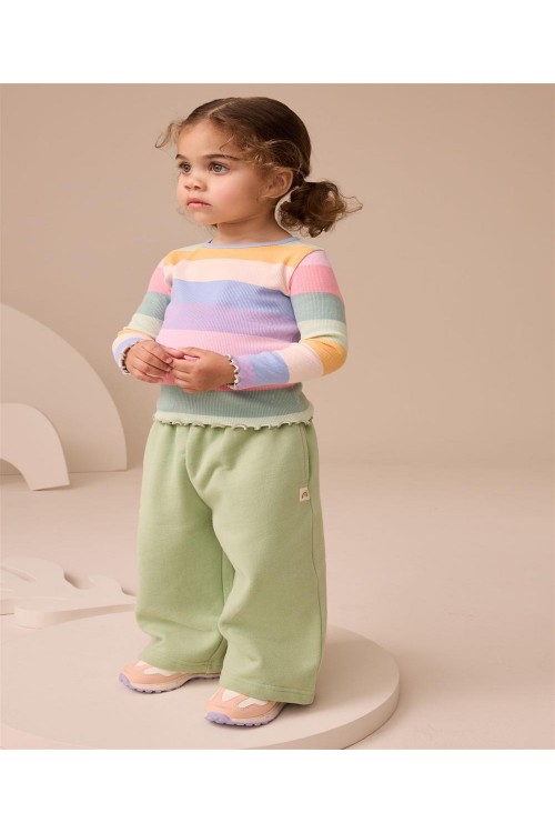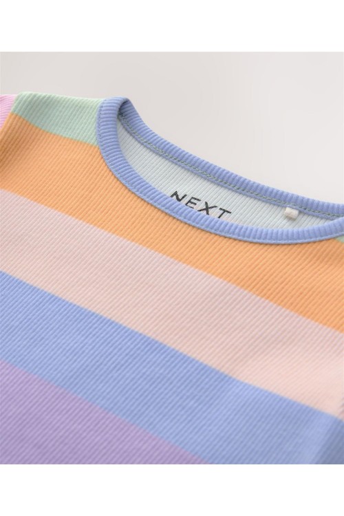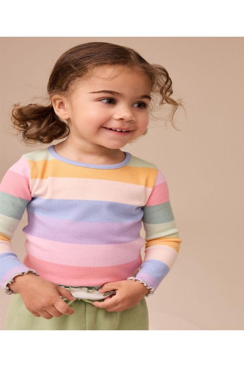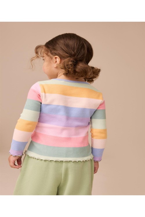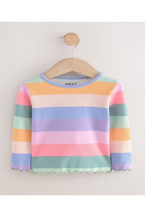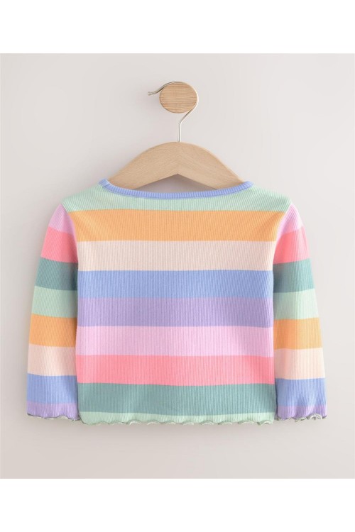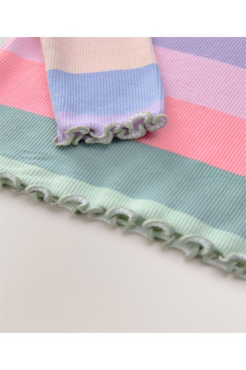 Тази очарователна рипсена блуза с дълъг ръкав с цветовете на дъгата е вълшебно допълнение към гардероба на всяко дете. Вълнообразният подгъв добавя чаровен акцент, а удобната материя гарантира комфорт през целия ден. Идеална за ежедневни приключения.