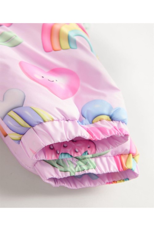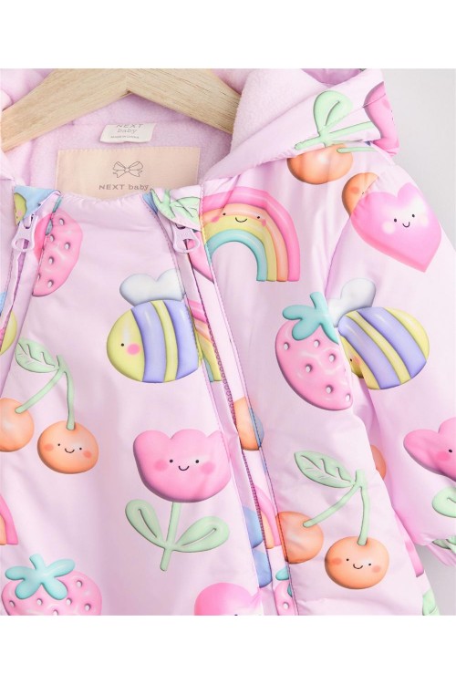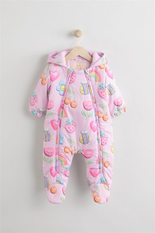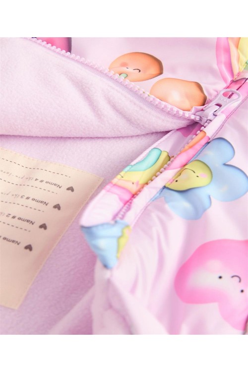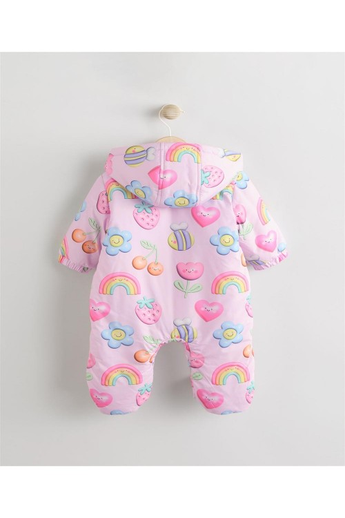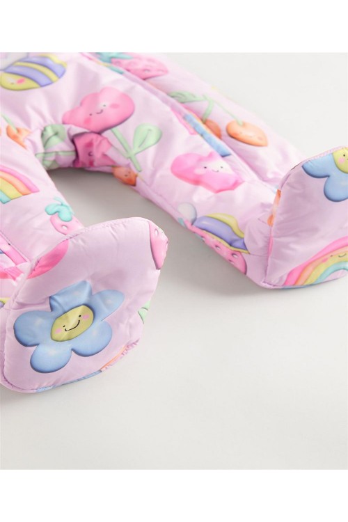 Този уютен комплект космонавт има двойно закопчаване с цип отпред и розов принт с герои по цялата повърхност, с топла поларена подплата, еластични маншети на ръкавите и вградени крачета.