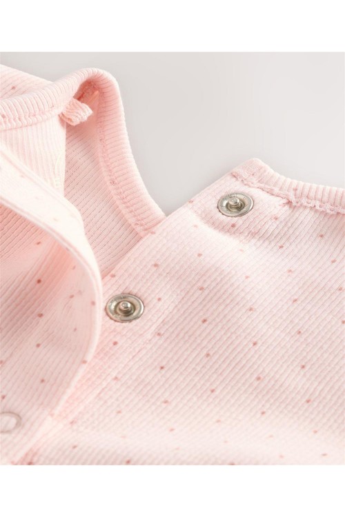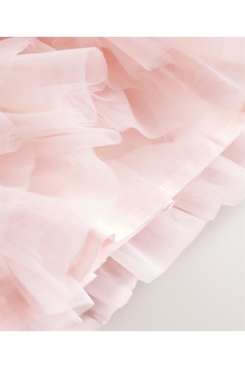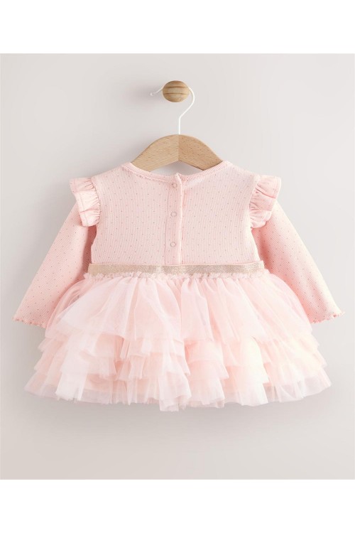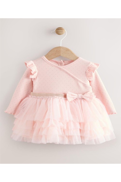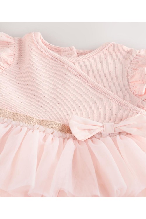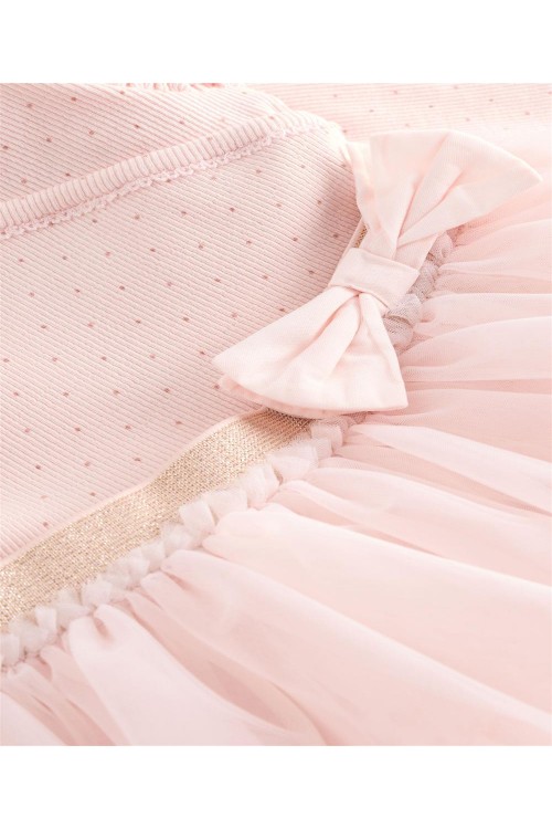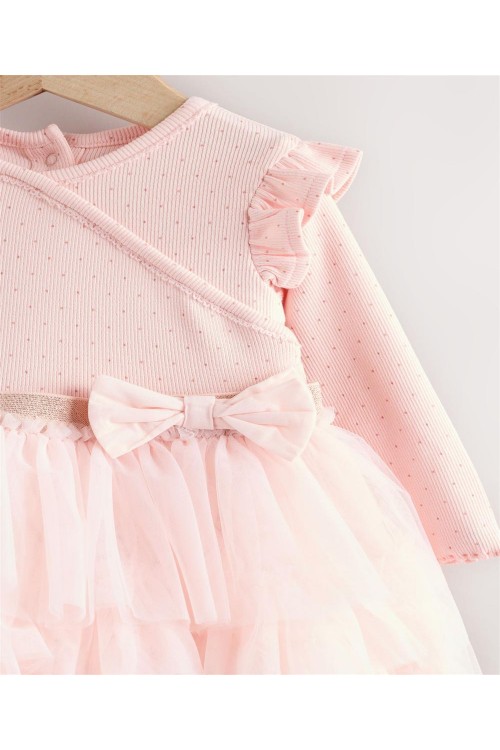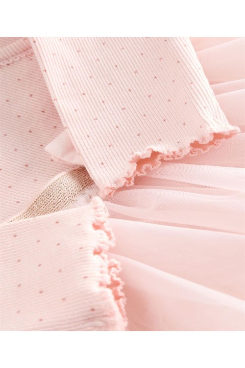 Тази очарователна рокля-пачка ще я накара да се чувства красива в розово, с рипсена горна част от памучна смес с щампа на точки, къдрички на раменете и панделка на талията, завършени с мрежеста многоетажна пола.