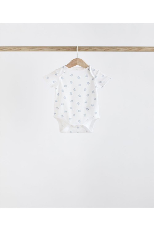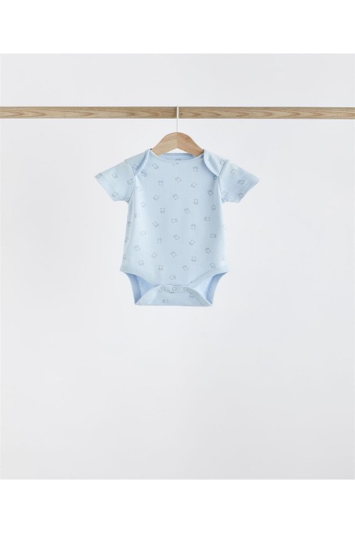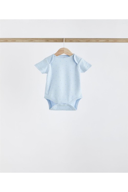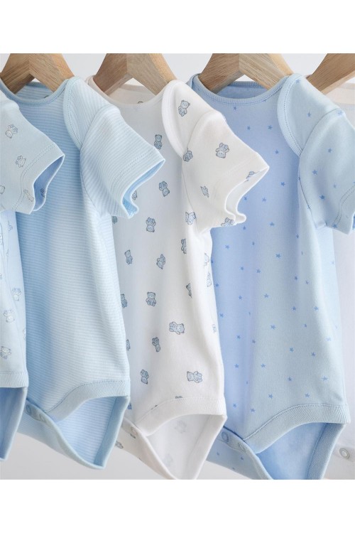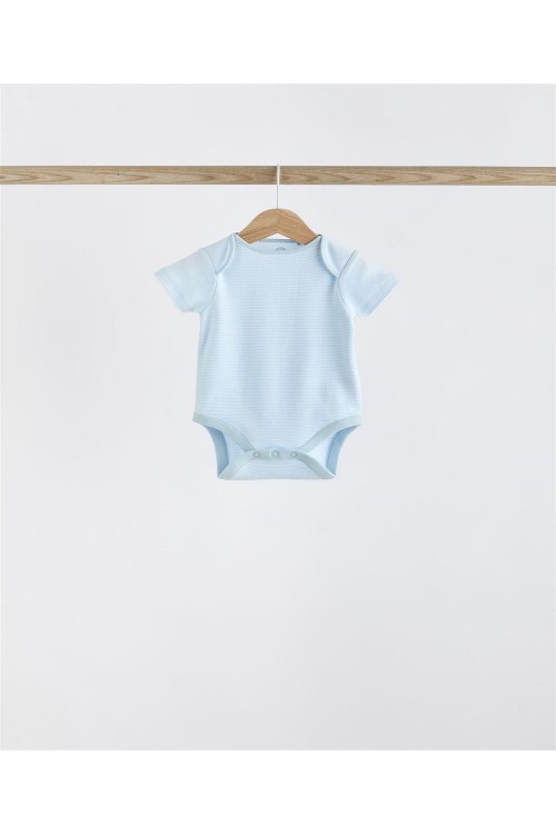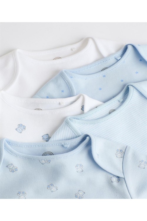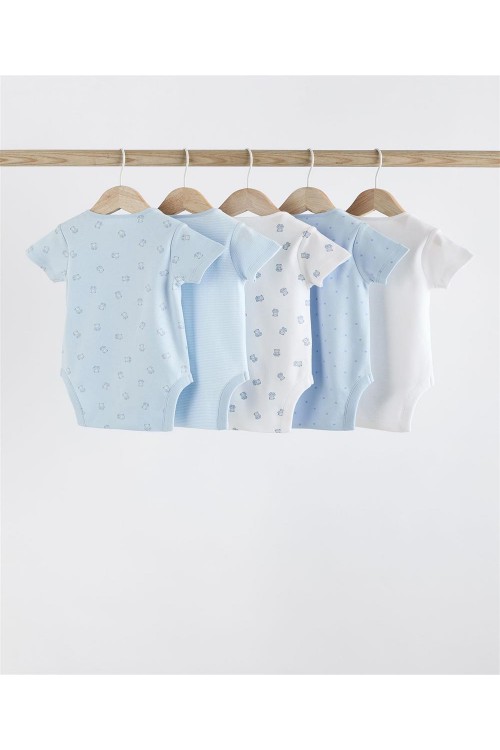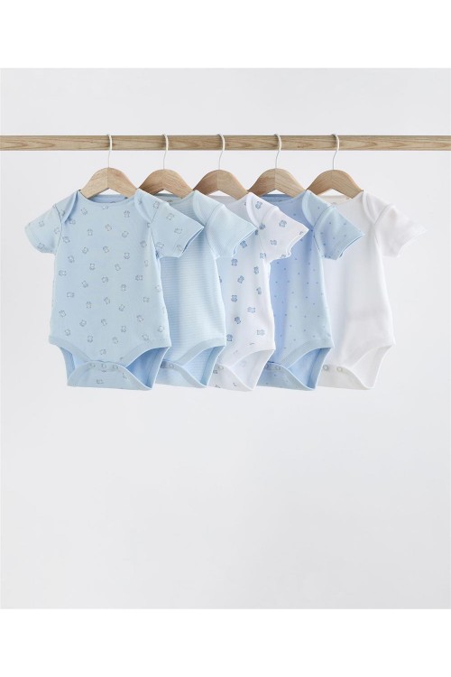Запасете се с най-важните неща за вашето бебе с тези 5 бр бодита от чист памук в сини и бели нюанси, с къси ръкави и закопчалка за лесно преобличане. Имат отпечатан етикет на врата за мекота на бебешката кожа.