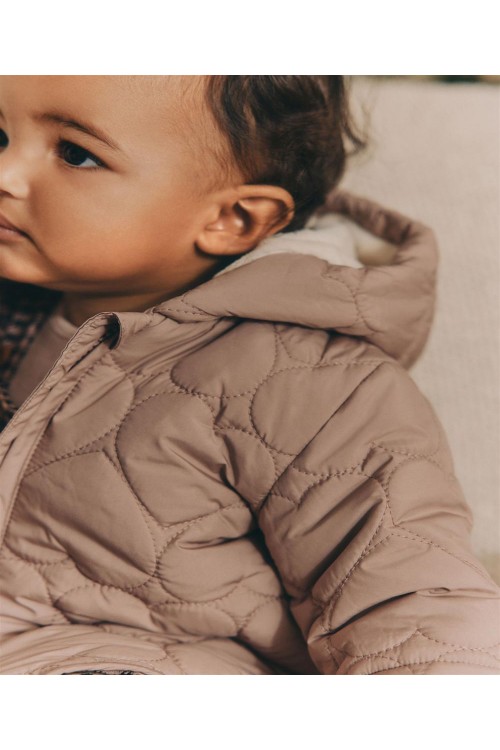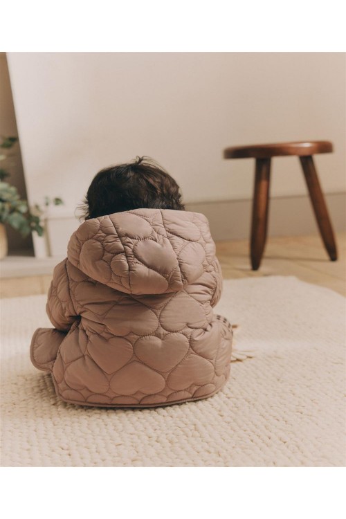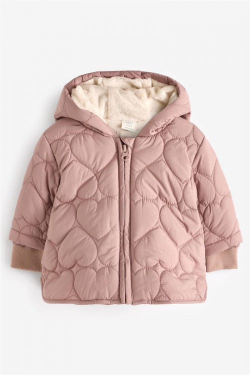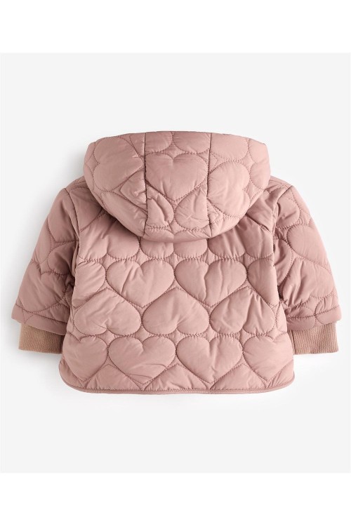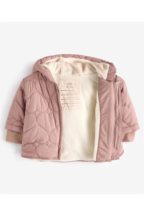 Това сладко и уютно розово яке е идеално за вашето мъниче, с цип и подплатена ватирана материя във формата на сърце, мека подплата от изкуствена кожа и оребрени маншети на ръкавите.