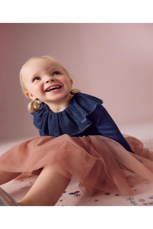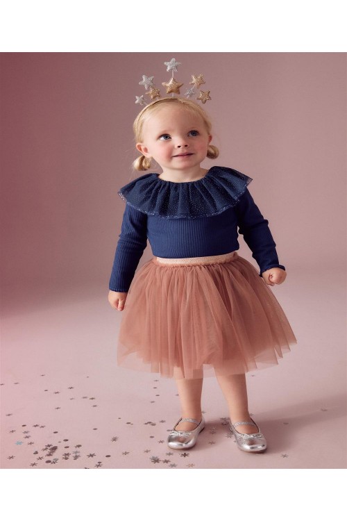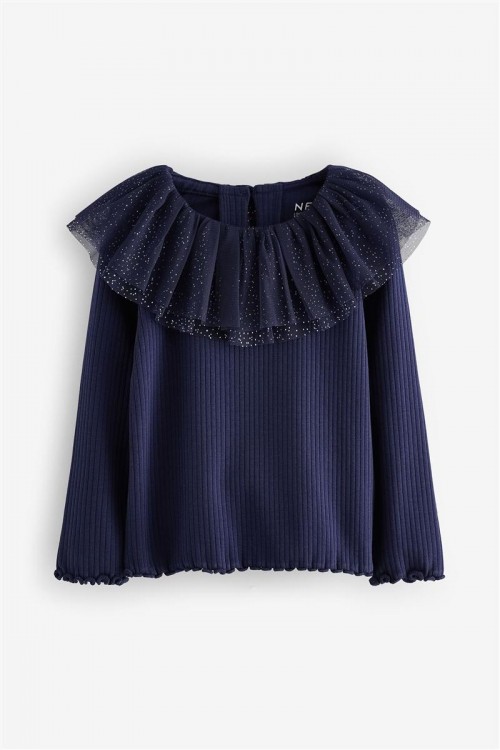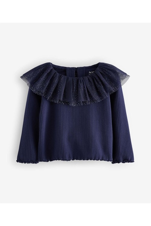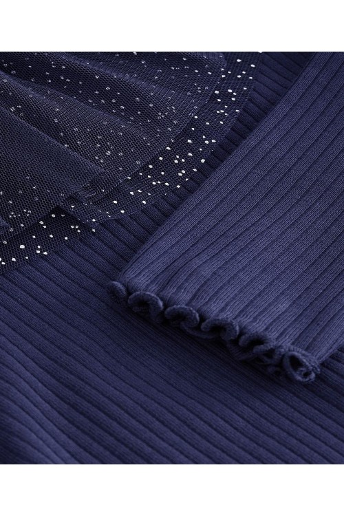 Елегантна тъмносиня блуза с дълъг ръкав и рипсена текстура, украсена с блестяща тюлена яка. Меката, еластична материя осигурява комфорт, а фините блестящи детайли добавят нотка изтънченост. Идеална за специални поводи или стилно ежедневие.