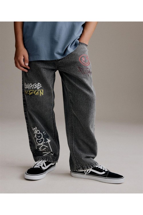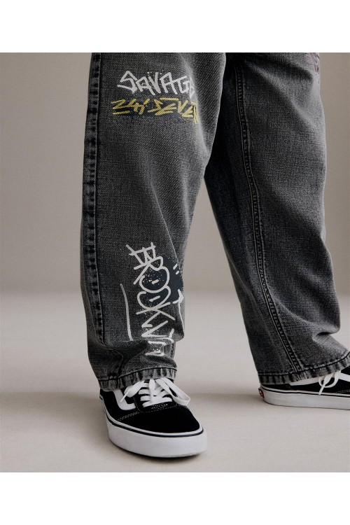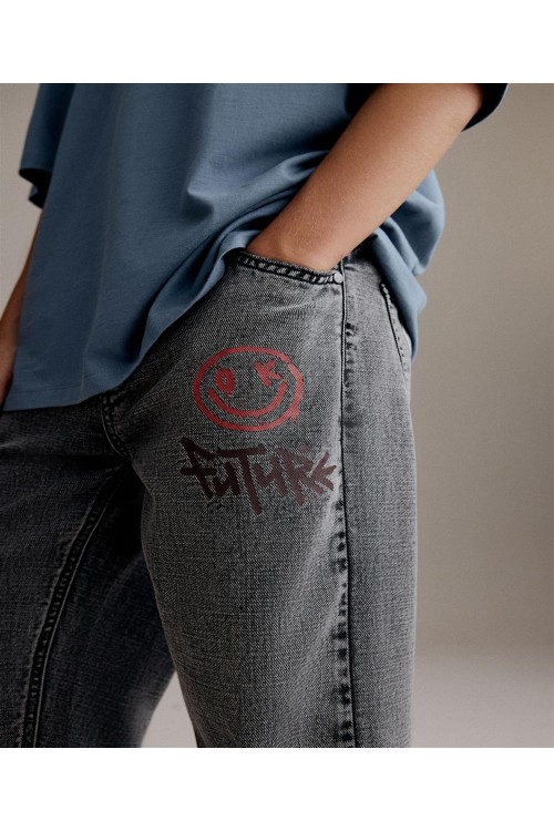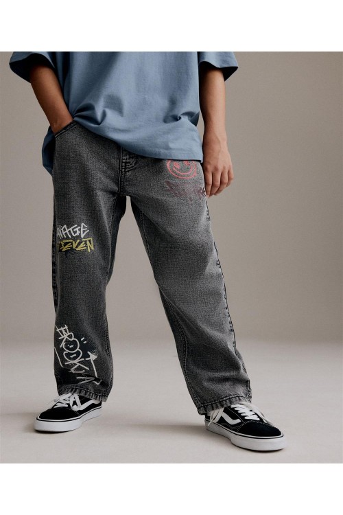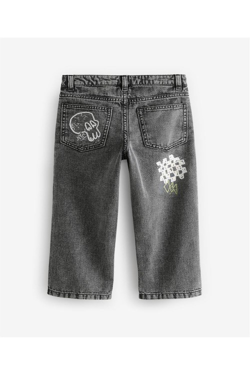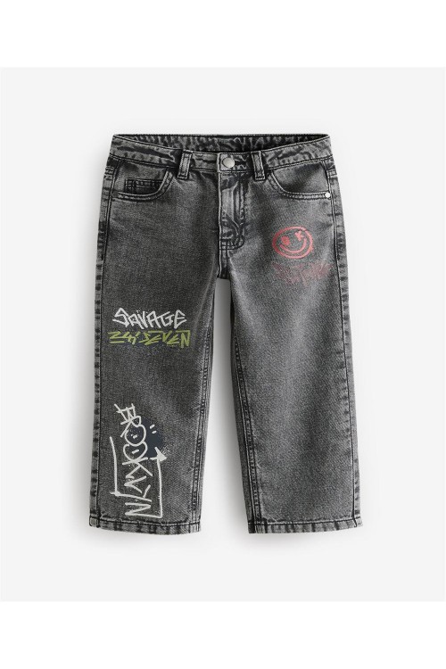 Изработени от чист памук, тези стилни тъмно сиви дънки имат регулируема талия с копче и закопчаване с цип, с графити по цялата повърхност и пет джоба. Съчетайте с любимата тениска или риза за стилна визия.