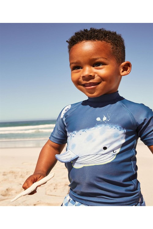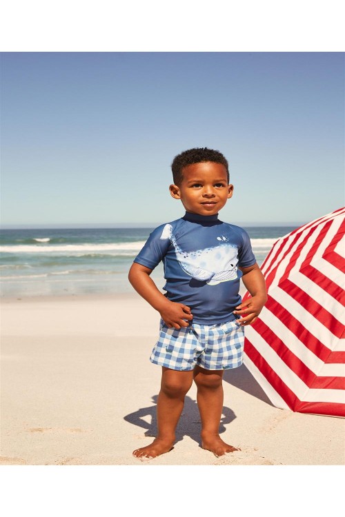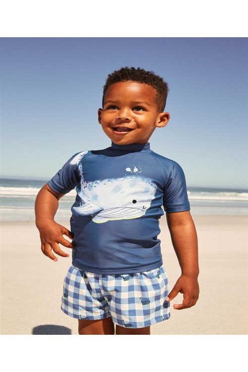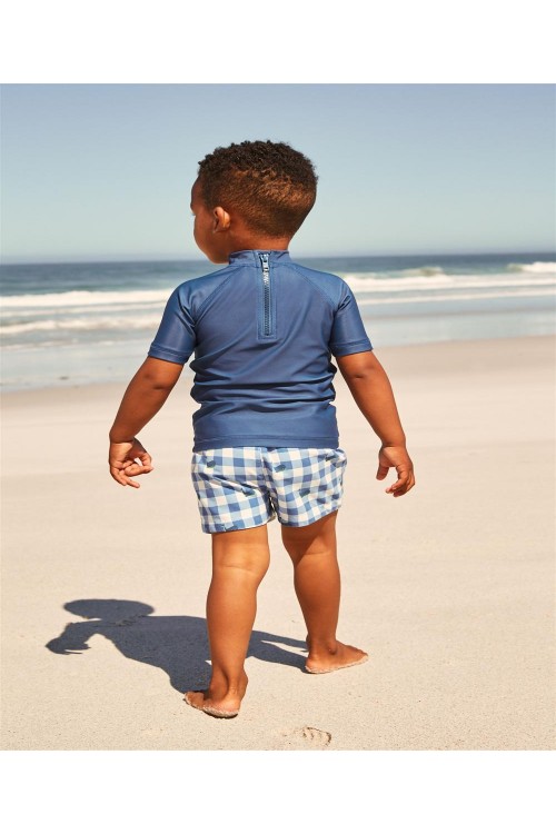 Този комплект от 2 части е чудесен за дни на плажа или край басейна, включващ къс ръкав, изработен от лека и еластична материя, осигуряваща UPF рейтинг 50+ и включващ цип на задната част на врата за деца на възраст 2 и по-малко години. Чифт съответстващи шорти допълват комплекта, завършени със странични джобове.