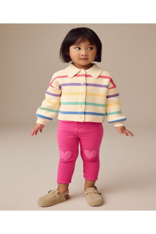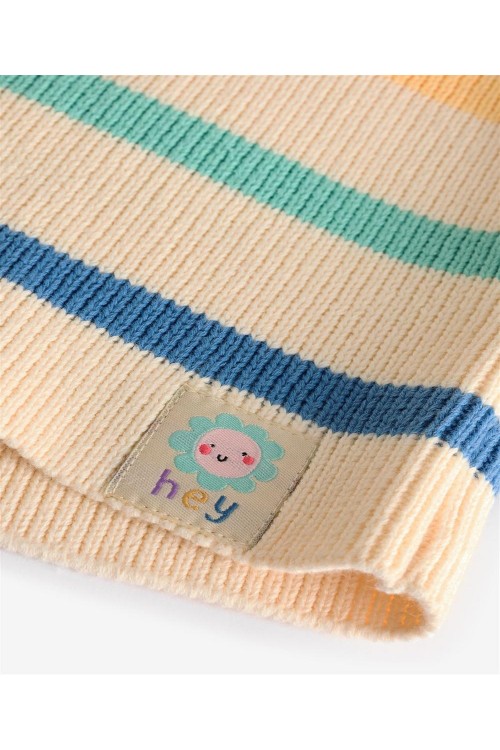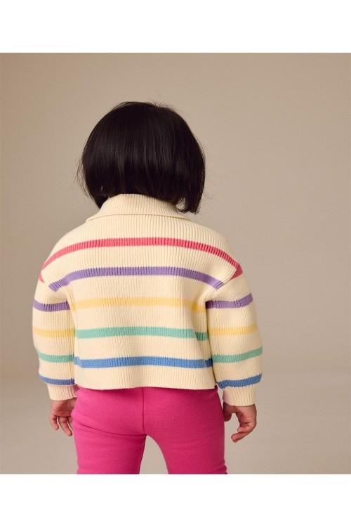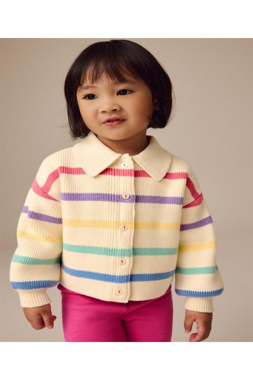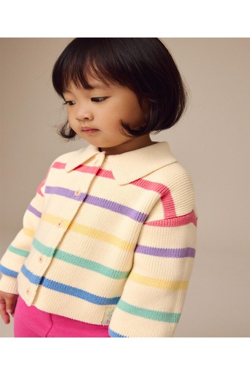 Добавете малко цвят към гардероба на вашето дете с тази плетена жилетка от чист памук с дизайн на цветни райета на неутрална основа. Жилетката има закопчаване с копчета, водещо до яка на врата.