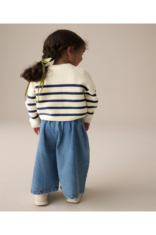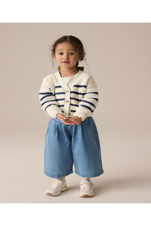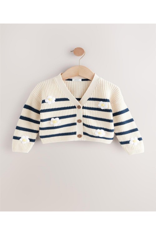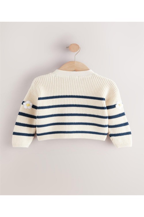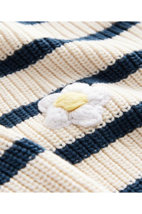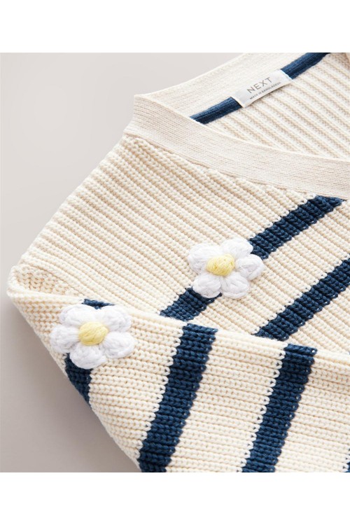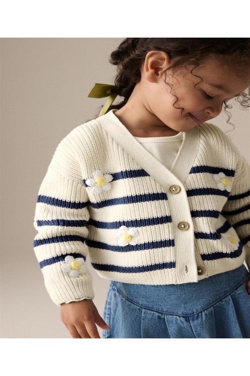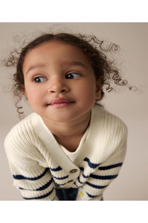 "Задължителна придобивка за вашето малко момиче. Нашата жилетка с V-образно деколте е на модерни райета със сладки детайли от маргаритки, за перфектния завършек на визията ѝ за уикенда. Изработена е от мек памук, V-образно деколте и копчета отпред.