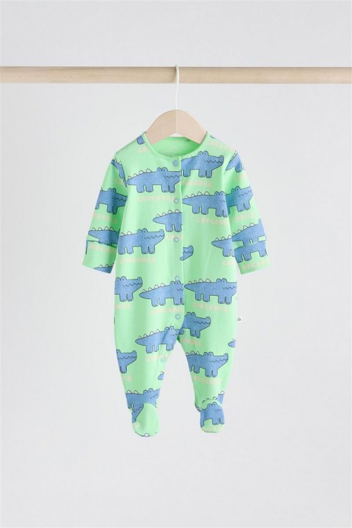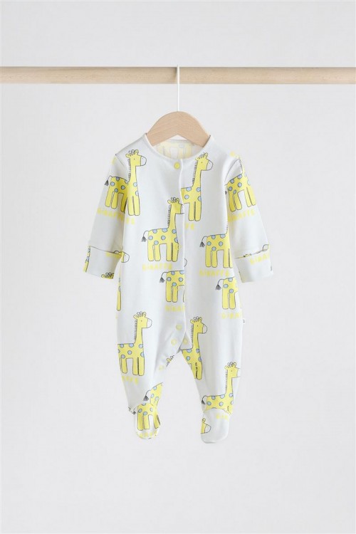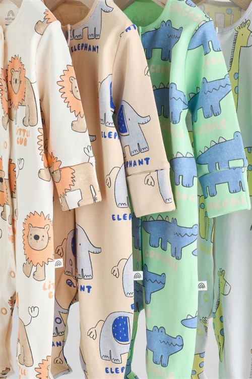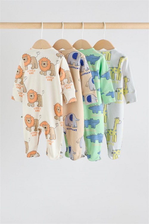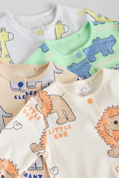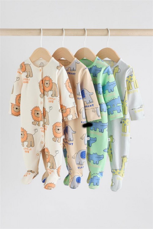 Този комплект от 4 бр. пижамки е изработен от чист памук, в колекция от ярки и цветни щампи с животински мотиви, за да направи лягането забавно. Всяка пижама има закопчаване с копче за лесно преобличане, ръкавици против драскане с обратна страна за деца до 3-6 месеца и противоплъзгаща се подметка с щампа от 9-12 месеца, нанесена върху вътрешната подплата на краката.