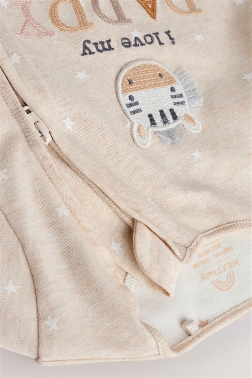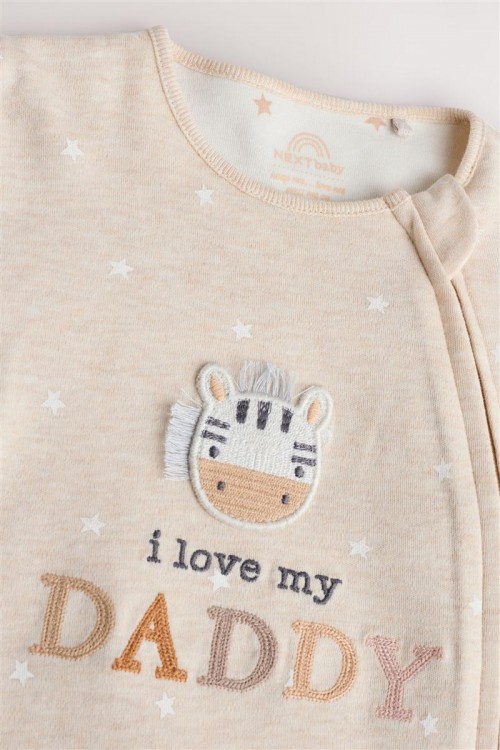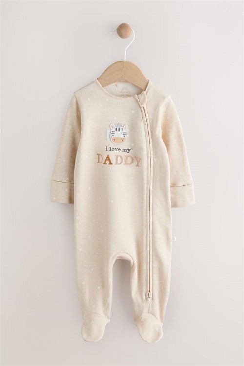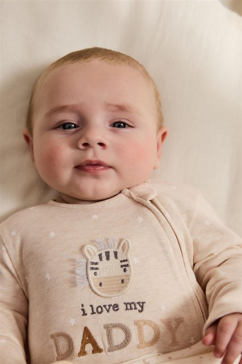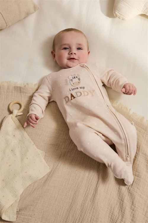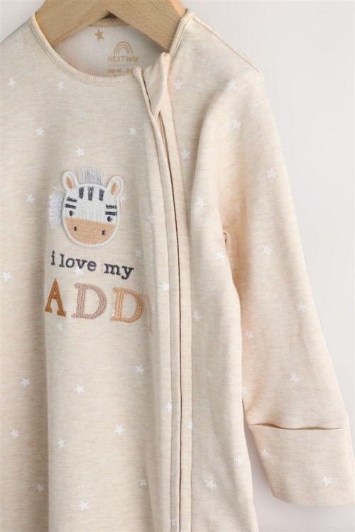 Тази очарователна пижамка гащеризон е изработен от чист памук, с бродирано сладко послание „Обичам тате“ на гърдите. Двупосочното закопчаване с цип улеснява преобличането,