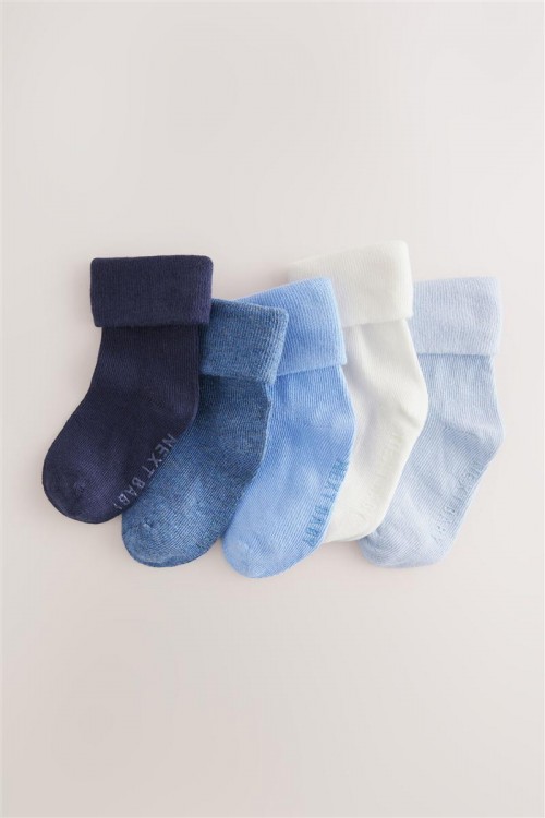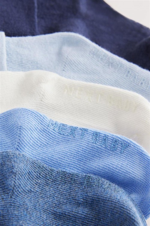 Този комплект от 5 чифта сини бебешки чорапи е изработен от памучна смес, с маншет на глезена, който се завърта отгоре, с бродирани детайли на подметката.