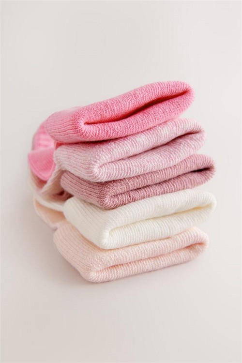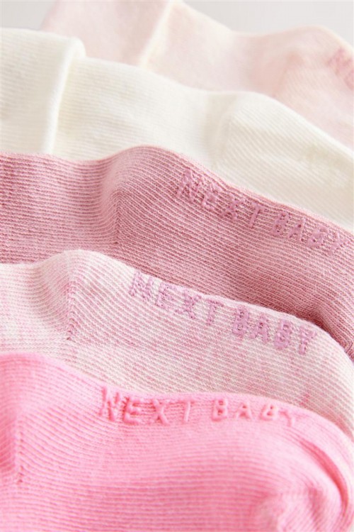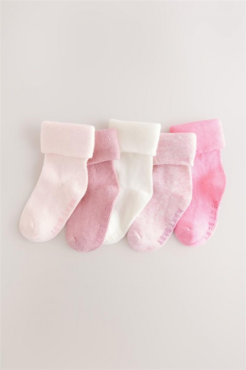 Този комплект от 5 чифта розови бебешки чорапи е изработен от памучна смес, с маншет на глезена, който се завърта отгоре, с бродирани детайли на подметката.