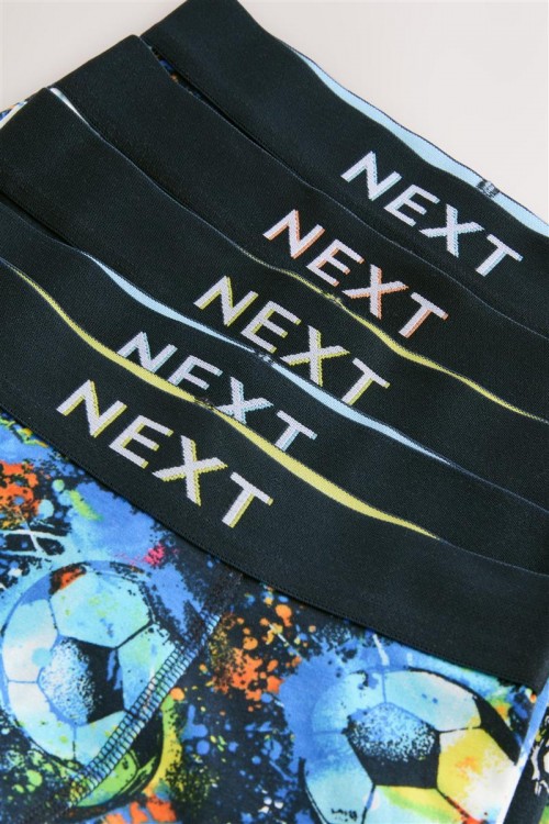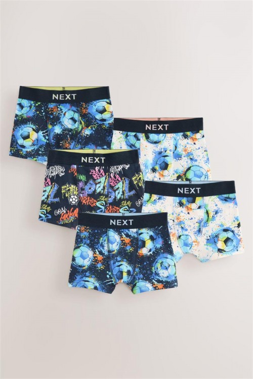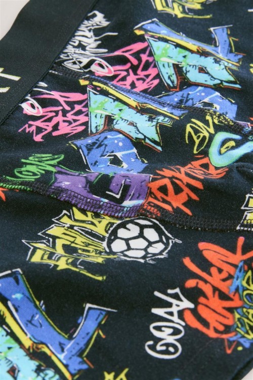 Комплект от 5 боксерки за момчета с цветни и игриви принтове в графити и футболни топки. Изработени от мек и дишащ памук с удобен еластичен колан за комфорт през целия ден. Перфектно ежедневно бельо с весел дизайн.
