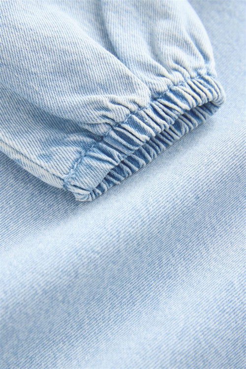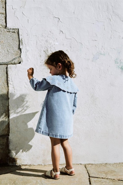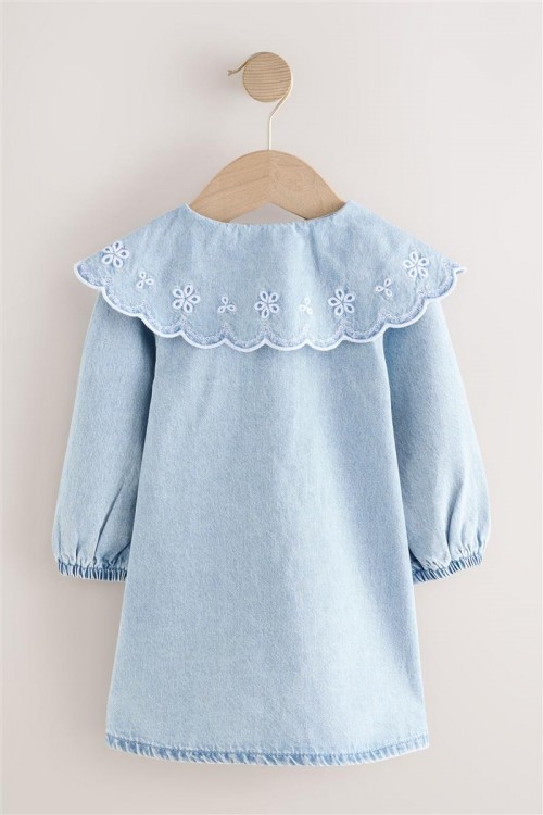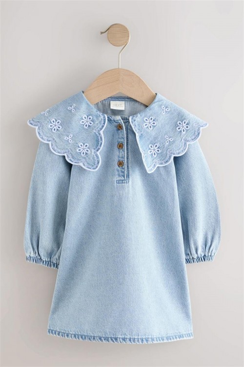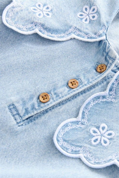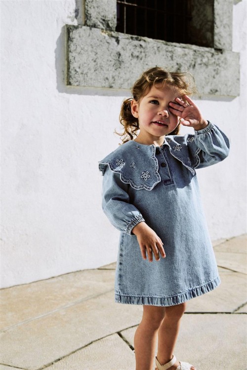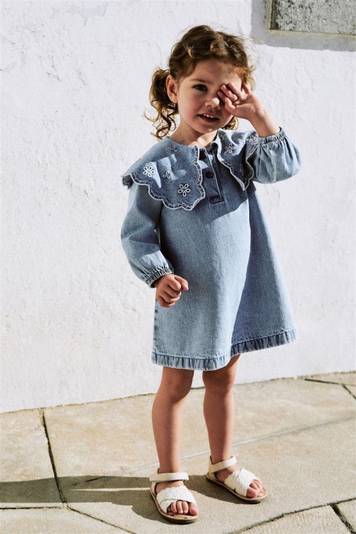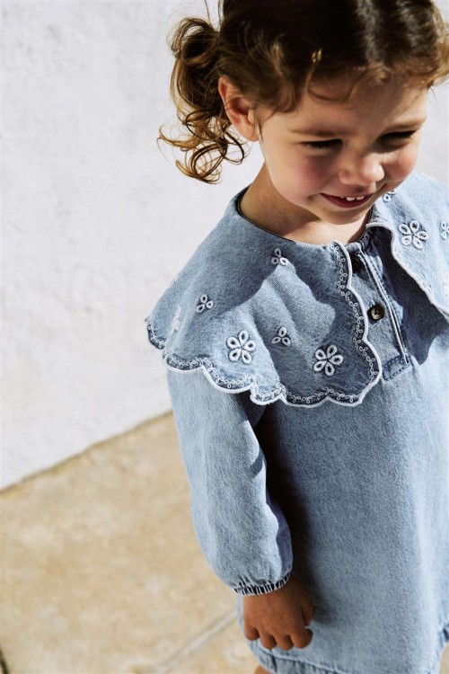 Вашето момиче ще изглежда невероятно стилно в тази прекрасна дънкова рокля с бродирана яка и копчета отпред.