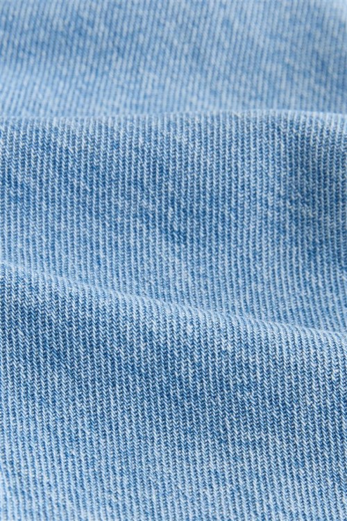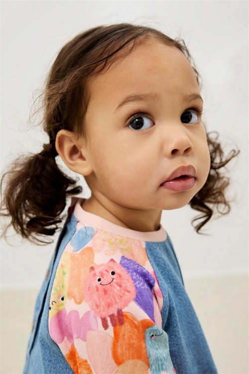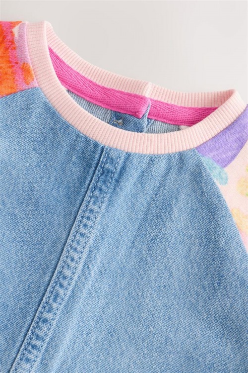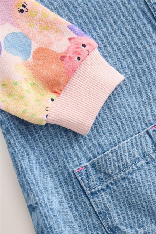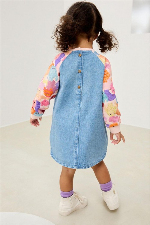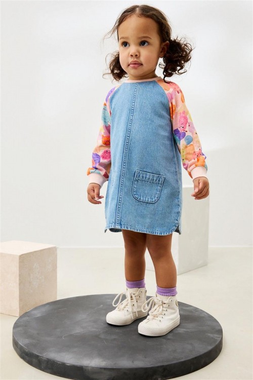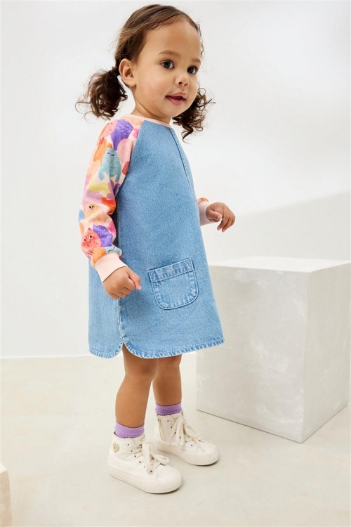 Тази очарователна дънкова рокля е с уникален дизайн, с ръкави от трико, предлагани в забавни щампи и цветове, с копче за закопчаване на гърба за лесно обличане и джобове отпред.