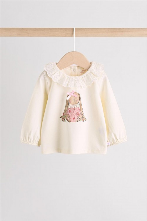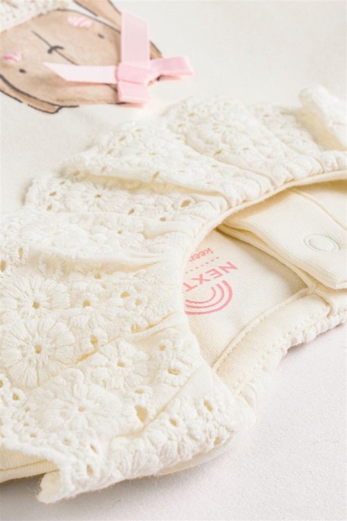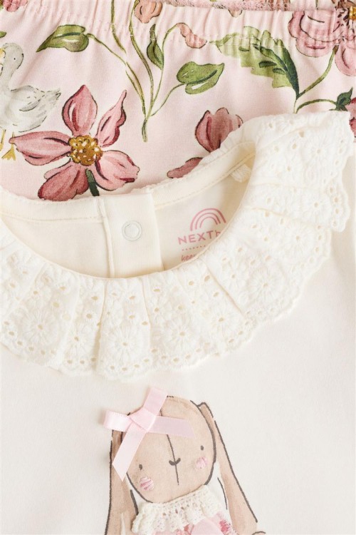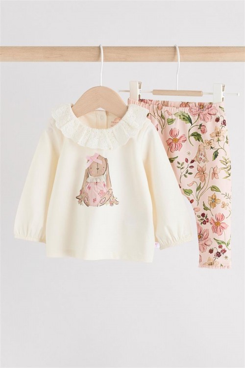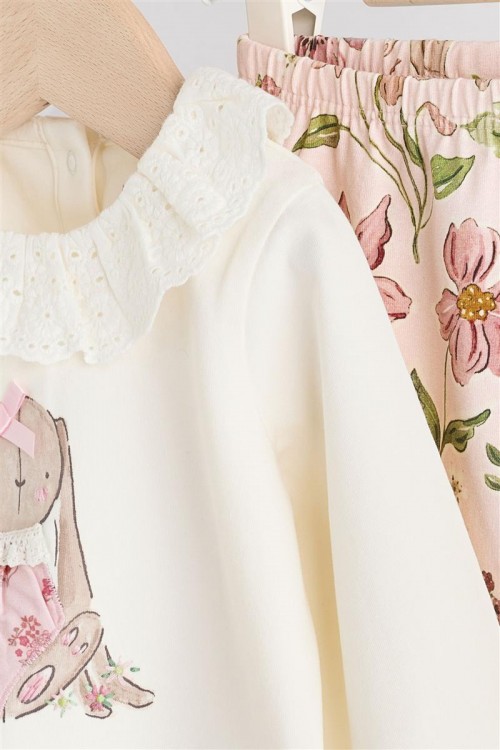 Този сладък комплект от 2 части е перфектна визия за есента, включващ дълъг ръкав, богат на памук, якичка и еластични ръкави, декориран с графика на зайче на гърдите с 3D панделка. Клин с флорален принт по цялата повърхност и еластична талия за лесно обличане.