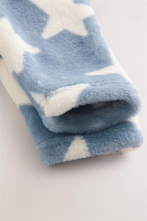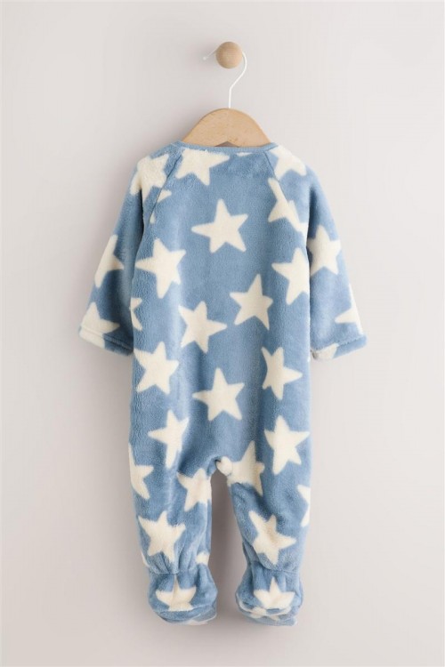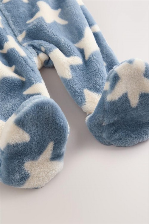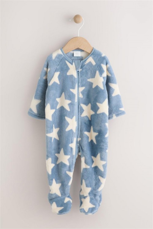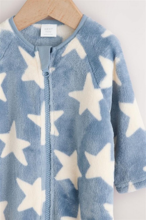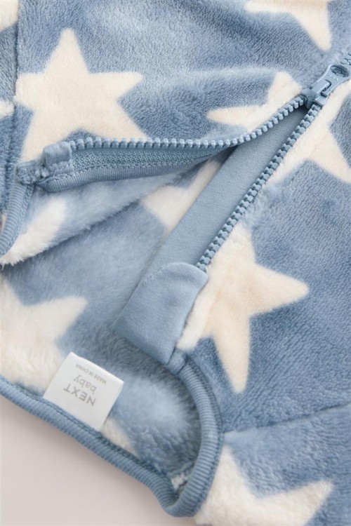 Вашето мъниче ще се чувства топло и уютно в нашата мека пижамка в синьо със звездички. С удобен цип за лесно преобличане. Може да се пере в пералня