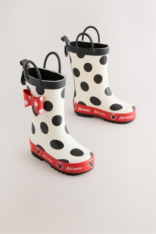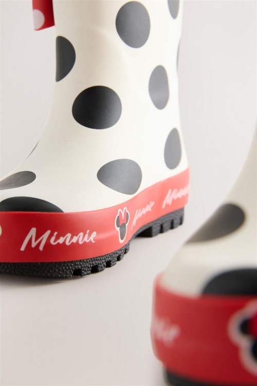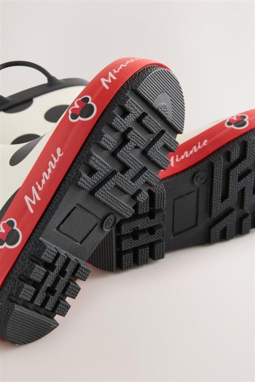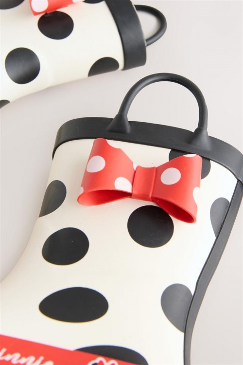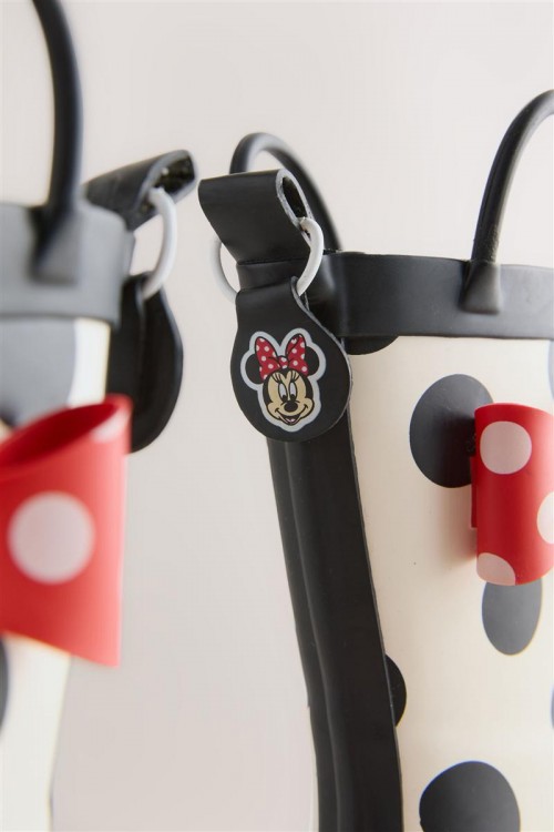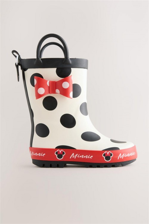 Тези класически гумени ботуши в бяло с черни точки, с невероятен акцент от едната страна- панделка и детайли с Мини Маус, са идеални за пръскане и игра в дъжда, с две дръжки за лесно обуване и противоплъзгаща се подметка.