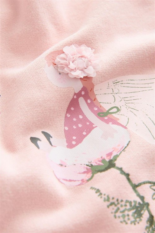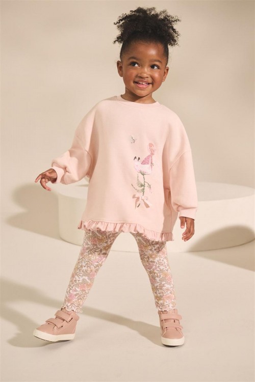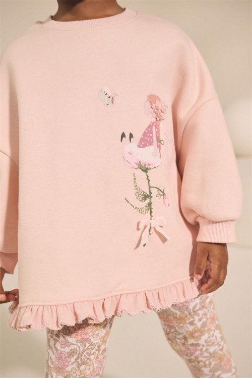 Удобен комплект от 2 части в розово. Мека и нежна блуза с дълъг ръкав със щампа и къдрички. Еластичен клин с флорални мотиви. Може да се пере в пералня.