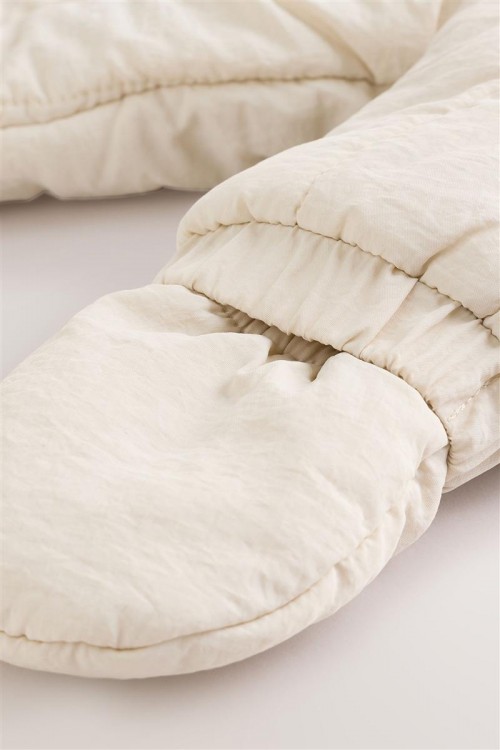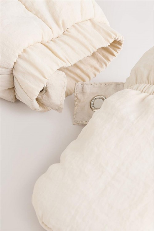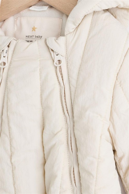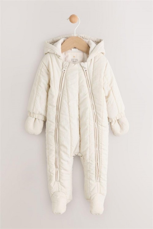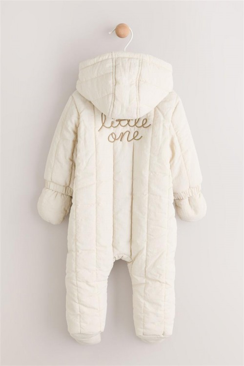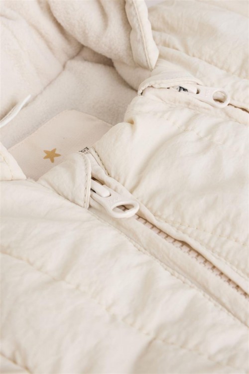 Осигурете топлина и уют на вашето бебе с този кремав зимен космонавт. С качулка, ръкавички, закрити крачета и двоен цип за лесно обличане, той е идеален за студените дни навън.