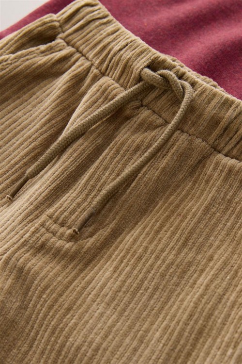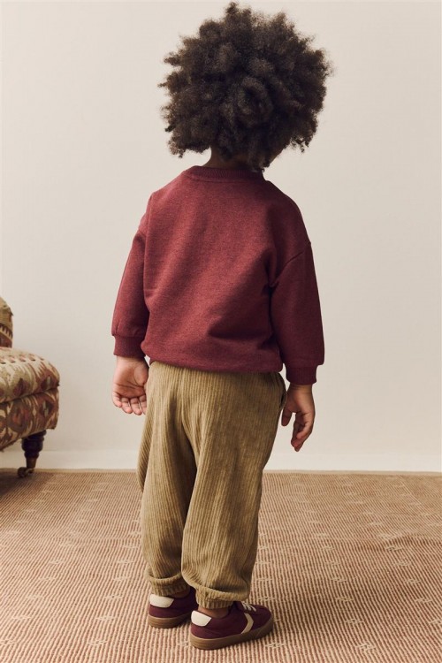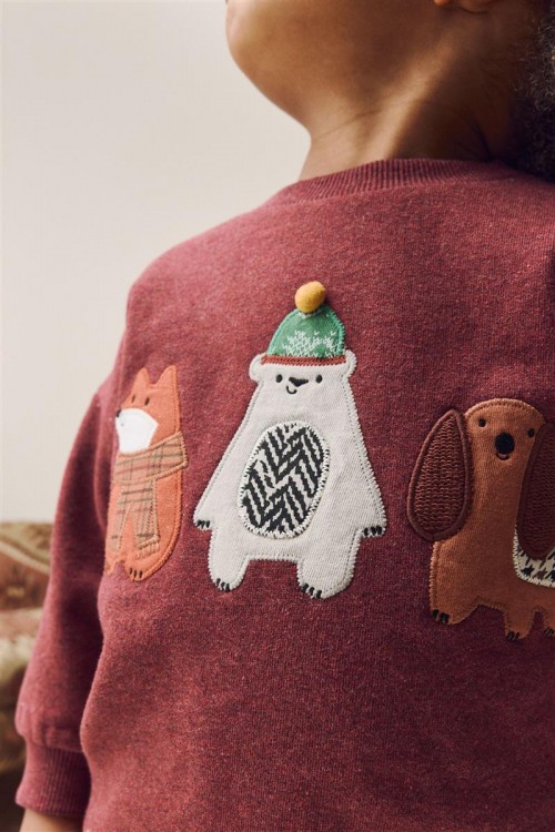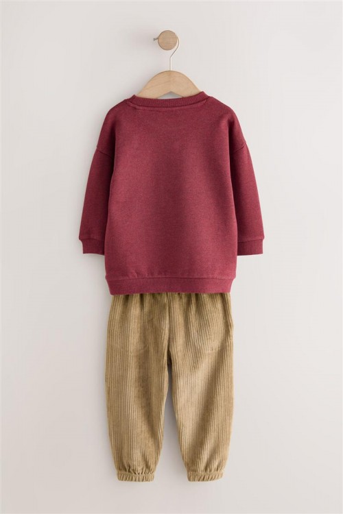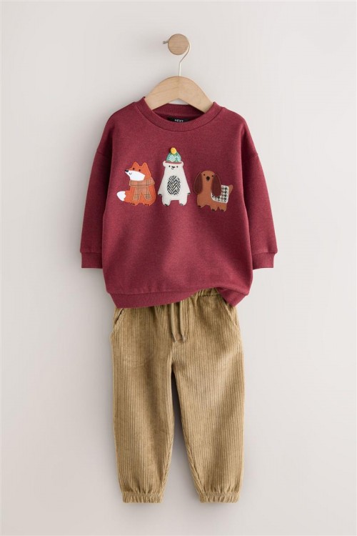 Очарователен детски комплект, съчетаващ удобство и забавен дизайн. Горнището е в цвят бордо с апликации на лисица, бяла мечка с шапка и кученце, придаващи игриво и уютно излъчване. Долната част е от меки, светлокафяви кадифени панталони с ластик и връзки на талията, както и ластични маншети на глезените за комфорт и свобода на движение. Идеален избор за ежедневни приключения през по-хладните дни.