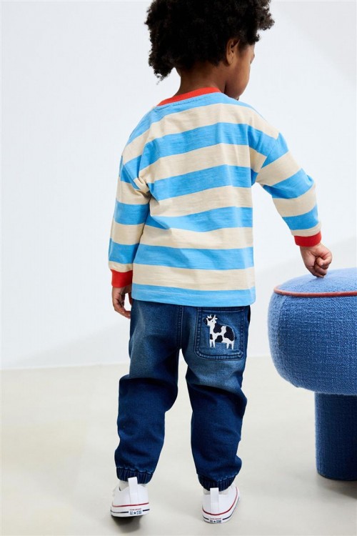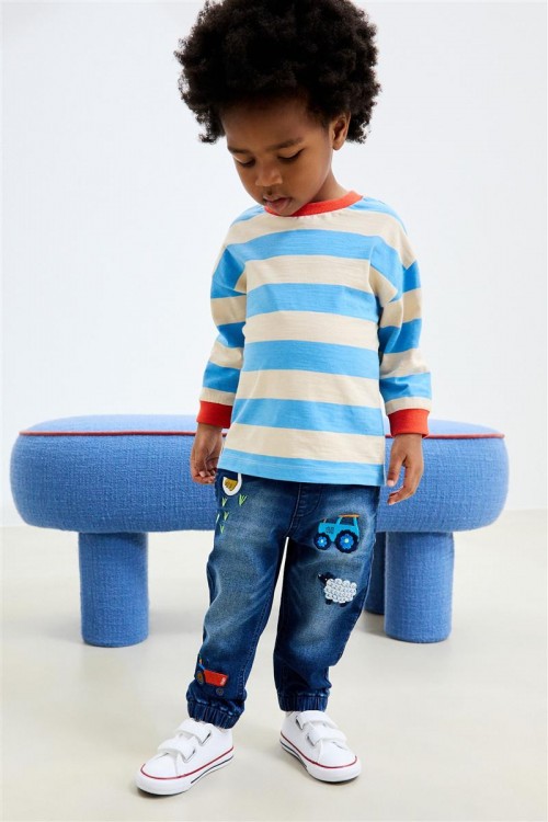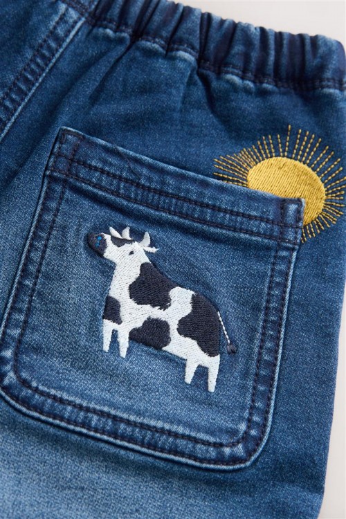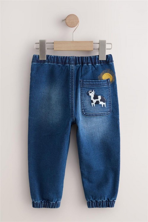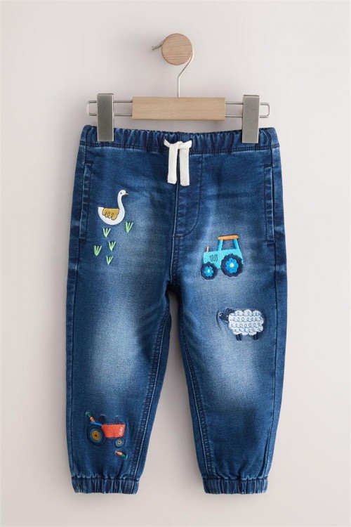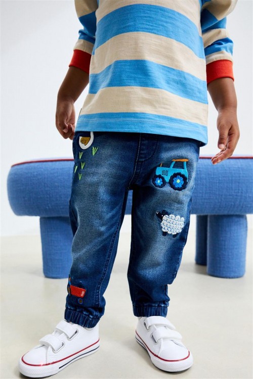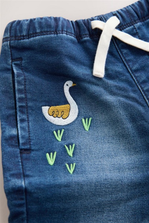 Идеални за ежедневни дни, тези сини дънки с пристягане предлагат едновременно комфорт и стил. Мекият материал и еластичната талия с връзки осигуряват удобно прилягане, а забавните бродирани нашивки добавят игрив щрих.