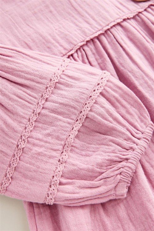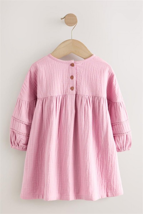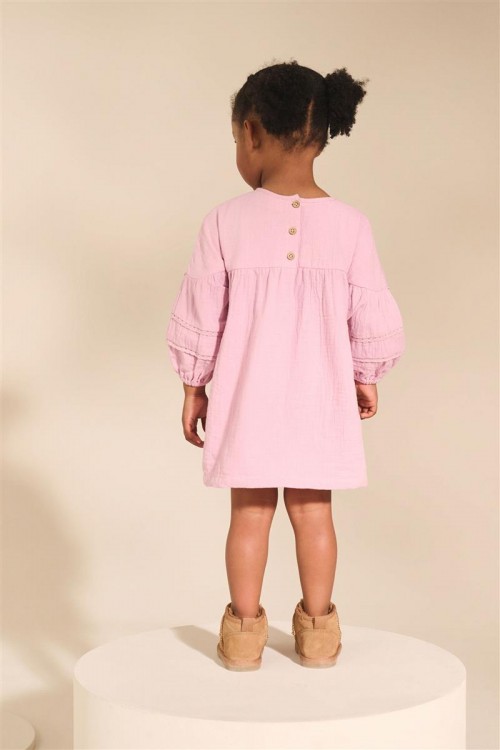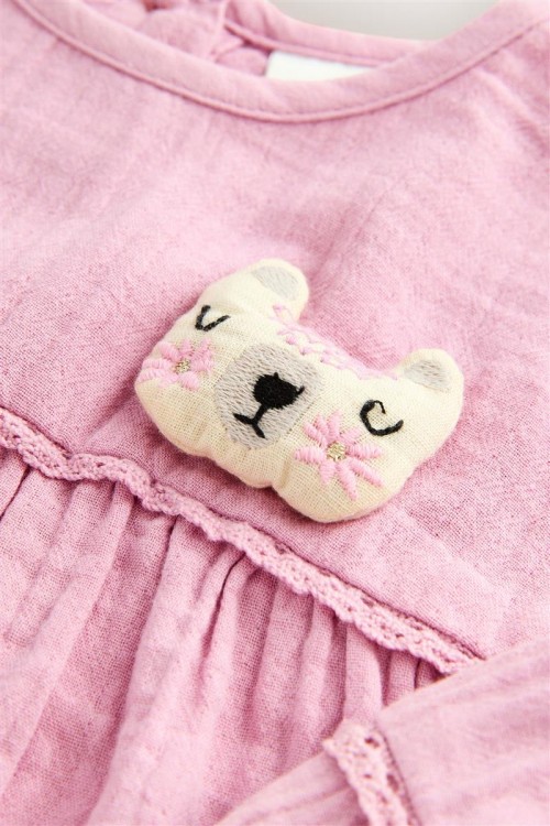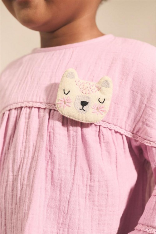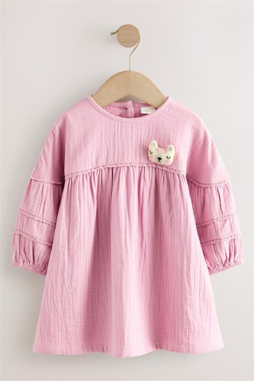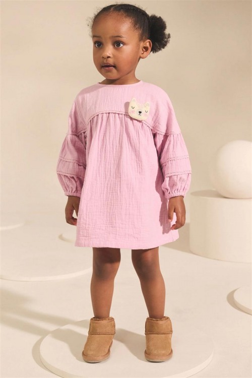 Очарователен избор за всеки ден – тази розова рокля е с дълги буфан ръкави, набран горен шев и сладка бродирана апликация на коте. Изработена от мек памук, тя е удобна, закачлива и подходяща за всякакви поводи.