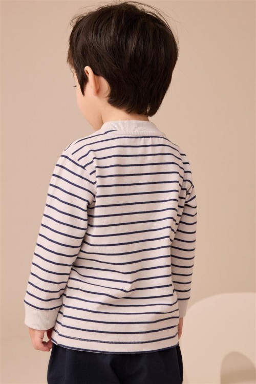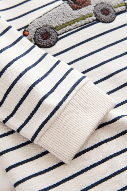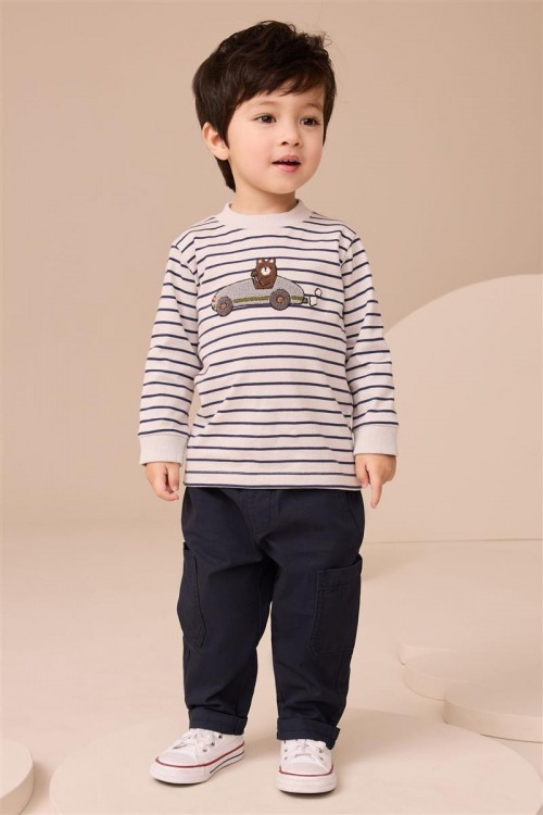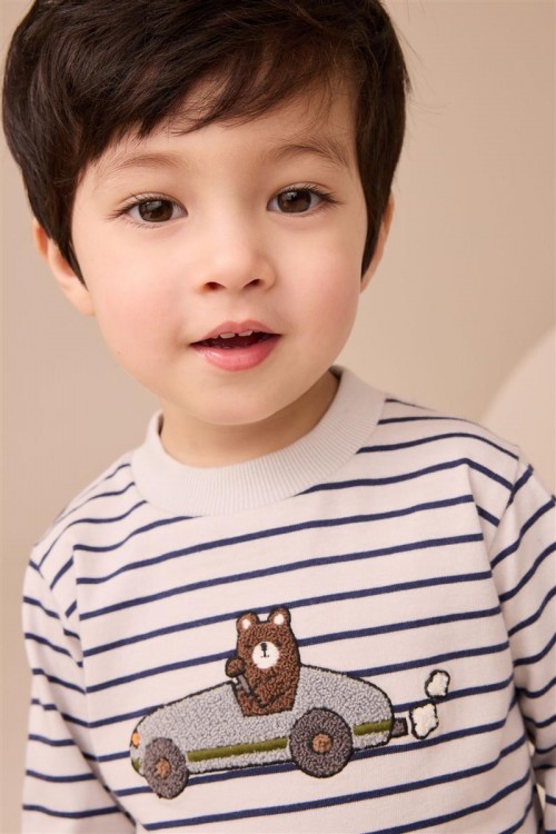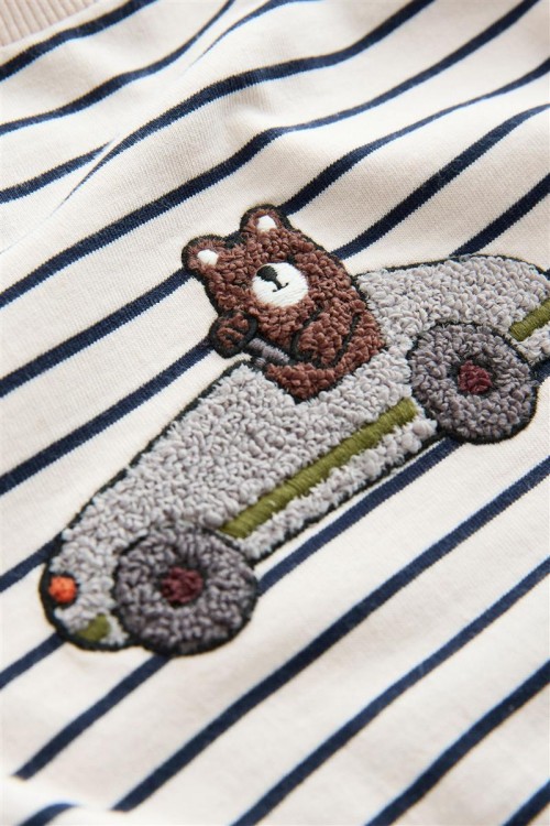 Добавете закачлив стил с тази раирана блуза с дълъг ръкав. С тъмносини райета и апликация на кола с мече шофьор, тя е изработена от мек памук за ежедневен комфорт и чар.