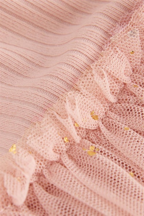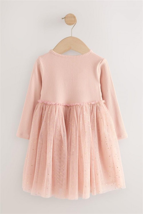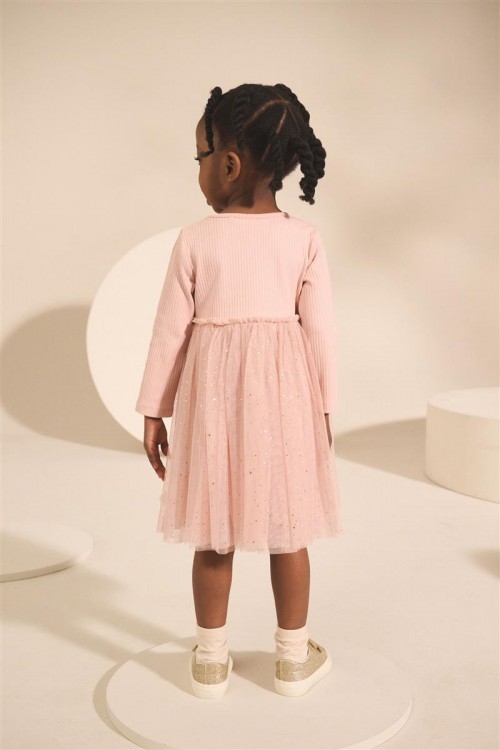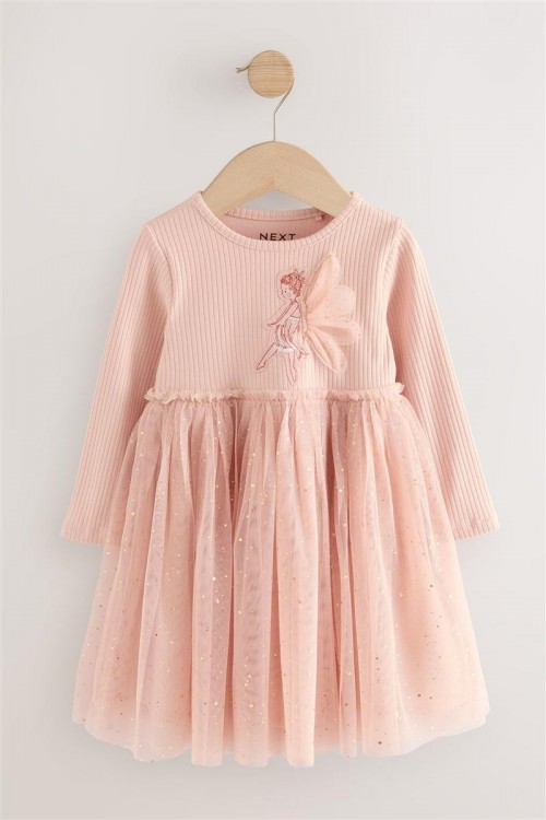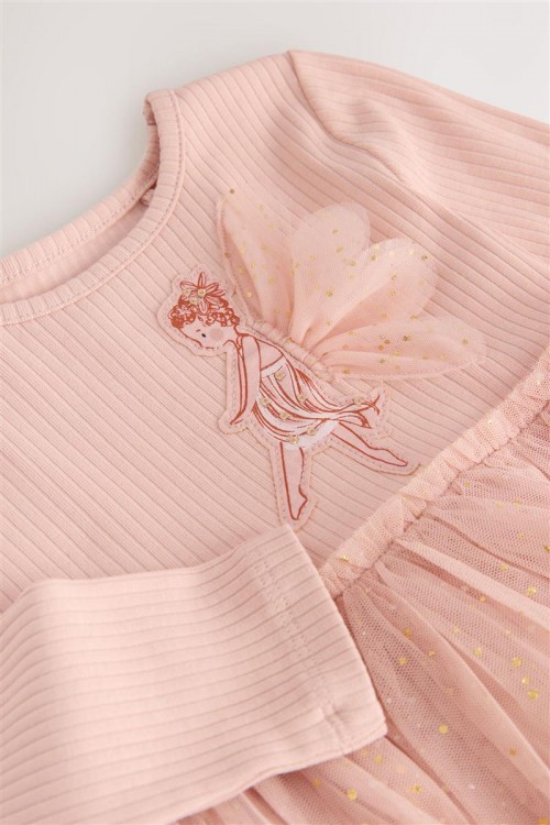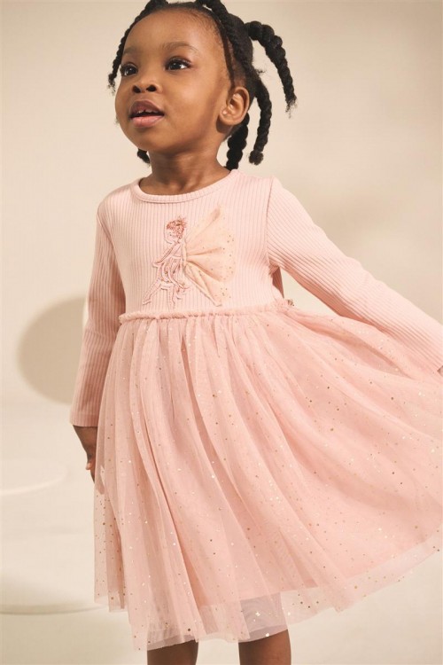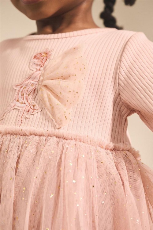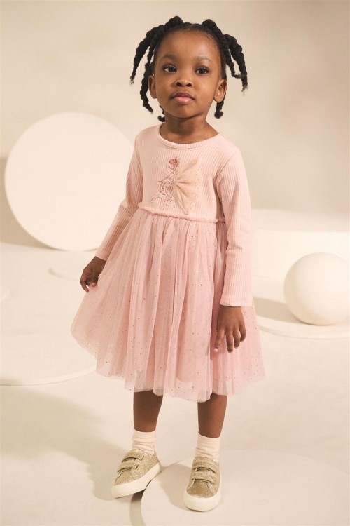 Красива рокля в балетен стил в нежно розово с дълги ръкави. С деликатна тюлена пола със ситни блестящи елементи и бродиран мотив на балерина отпред. Идеална за партита, рождени дни или специални поводи.