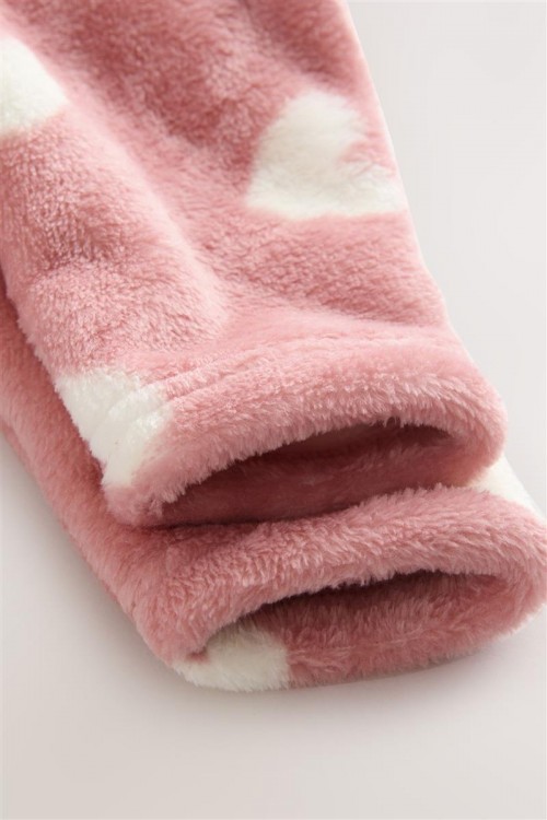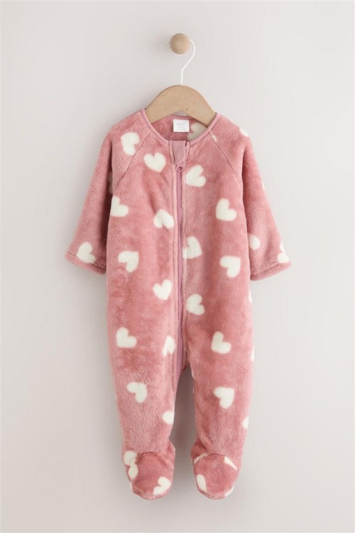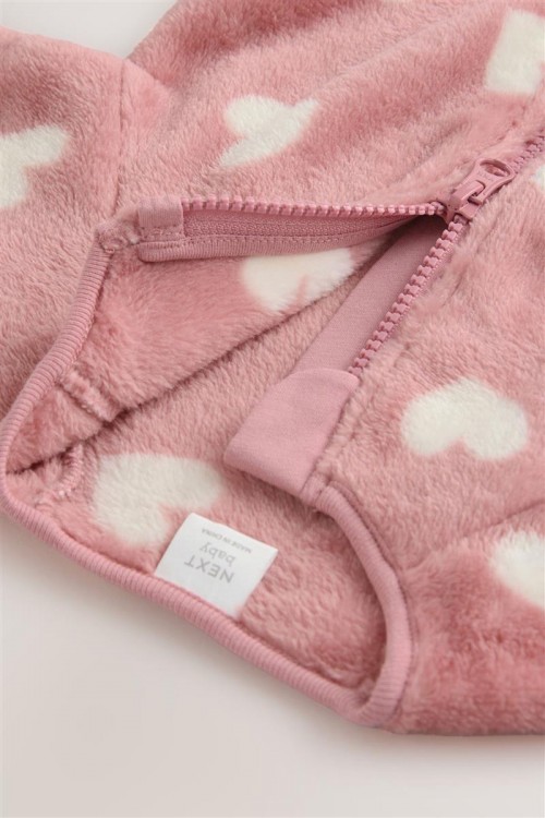 Сладка и уютна бебешка пижама в розово, изработена от изключително мек полар и украсен с очарователни бели сърчица. С удобен цип отпред за лесно обличане и закрити крачета за топлина и комфорт. Идеален за гушкане, игра и спокоен сън.