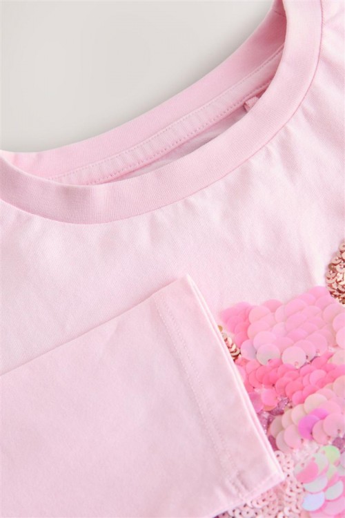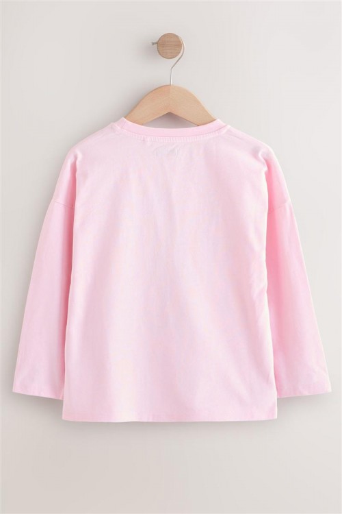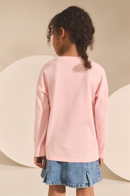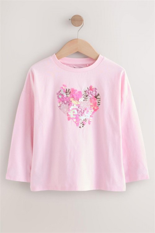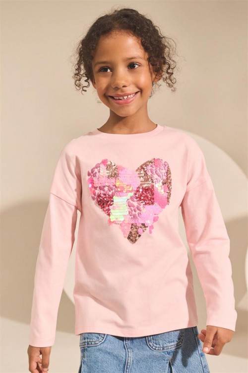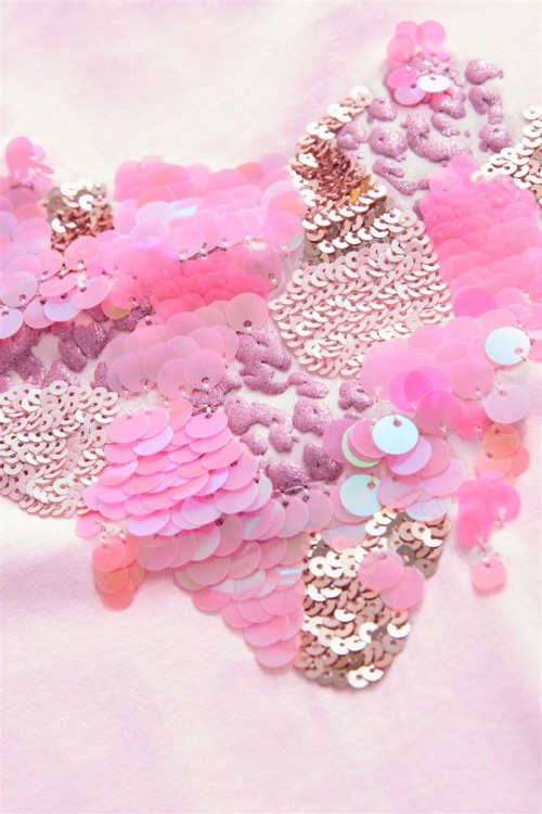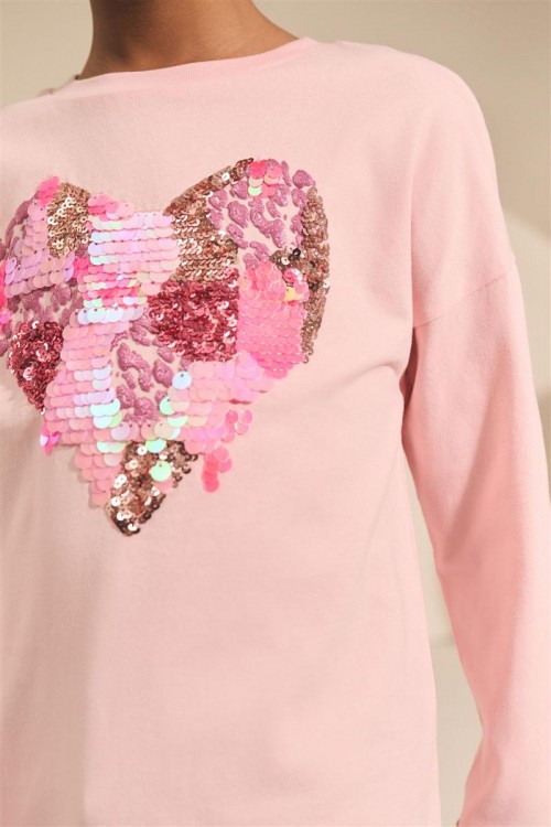 Стилна розова блуза с дълъг ръкав и блестящо сърце от пайети. Удобна и мека, подходяща за ежедневието и същевременно добавяща щипка блясък. Задължителен избор за момичета, които обичат малко блясък в облеклото си.