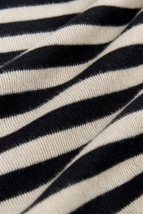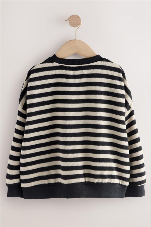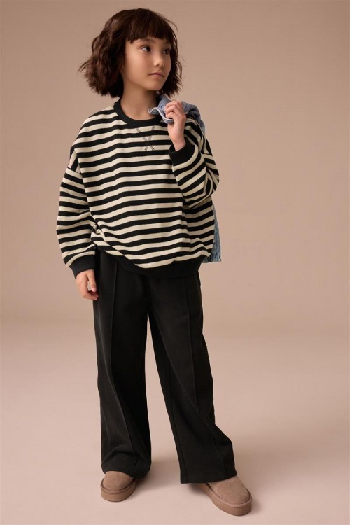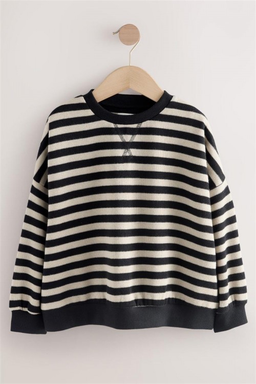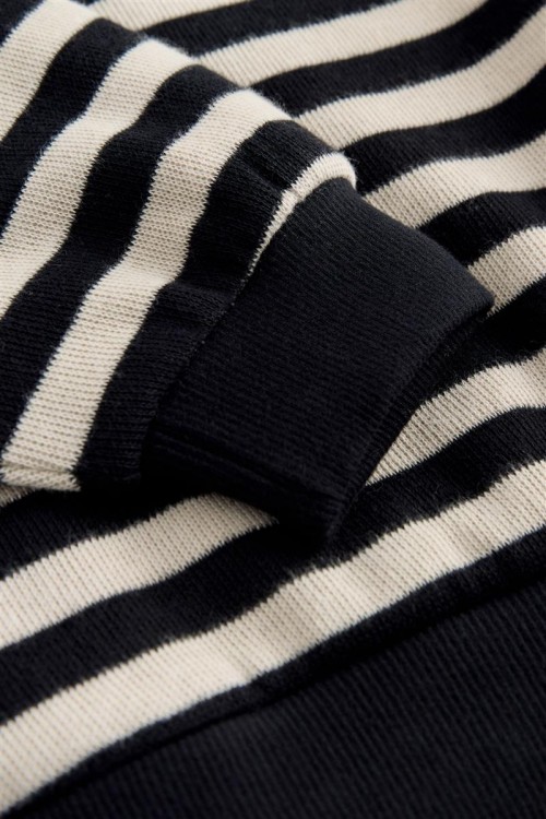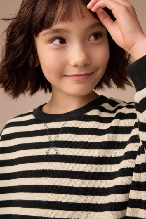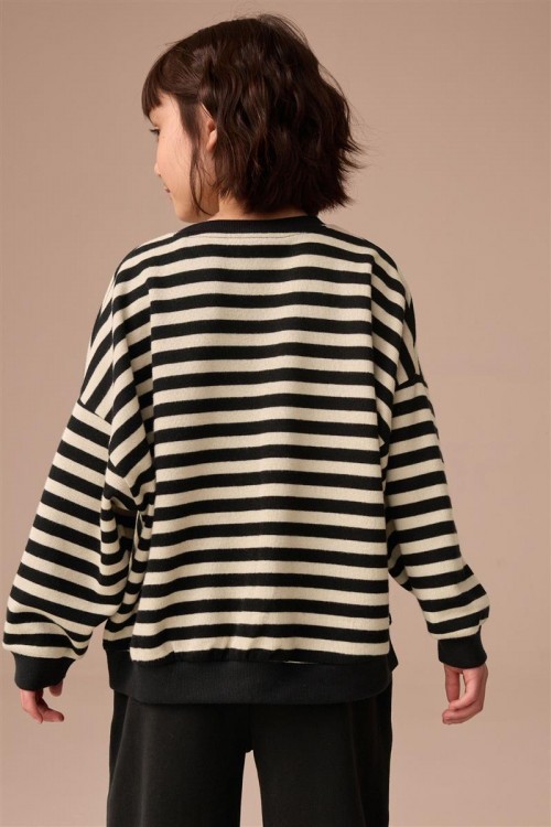 Класически детски суитшърт с черно-бели хоризонтални райета. С рипсени маншети, подгъв и обло деколте за удобно прилягане. Изработен от мек памучен плат – универсална и удобна дреха за всекидневно носене
